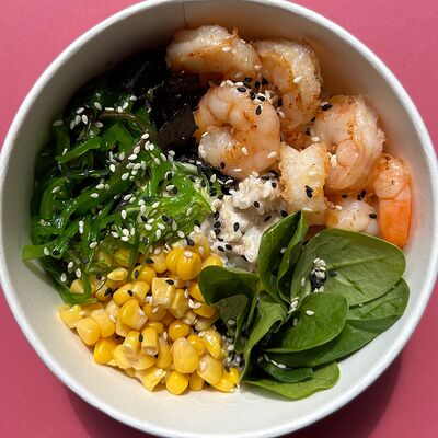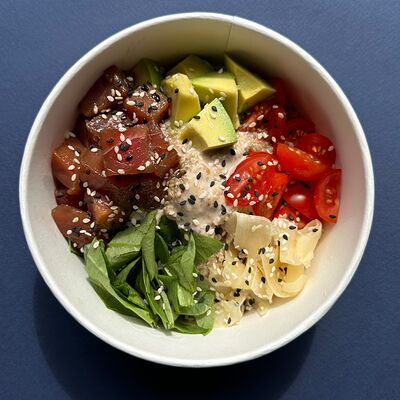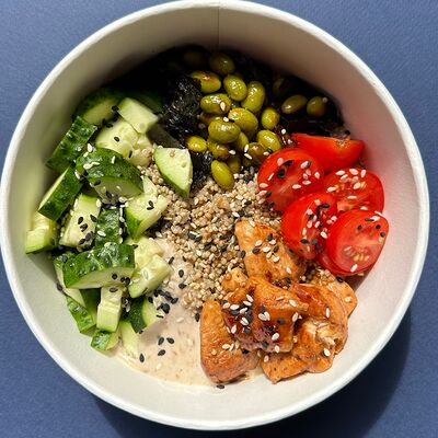 Огурец, помидор, киноа, филе цыпленка, ореховый соус