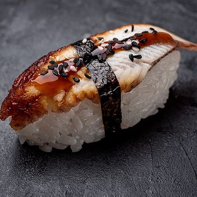 Рис, угорь, соус унаги, творожный сыр, манго, кунжут белый, кунжут черный