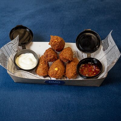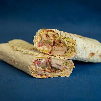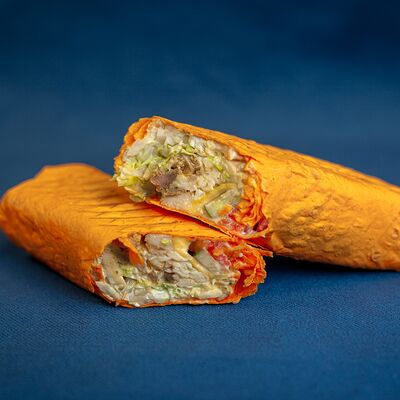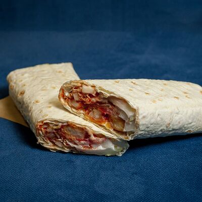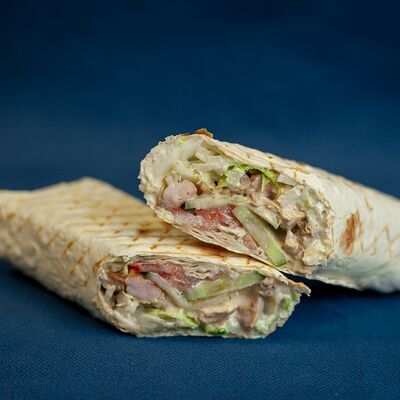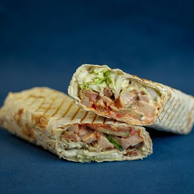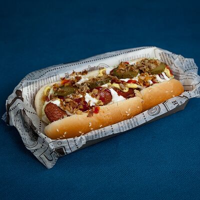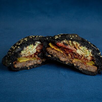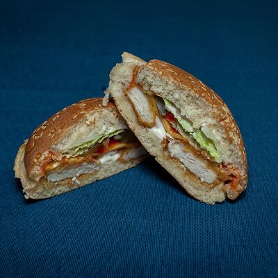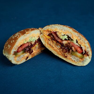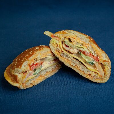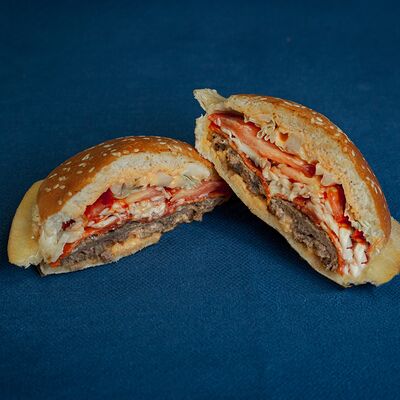 Закрытый бургер с колбасками пепперони и говяжьей котлетой, сыром моцарелла, листом салата, помидором, в сочетании соусов фирменный бургер Omg и том ям