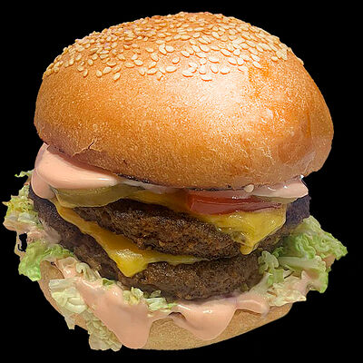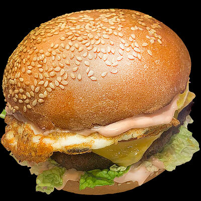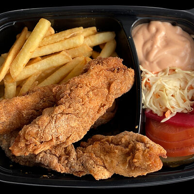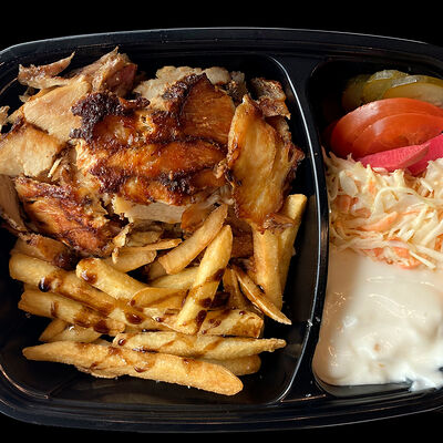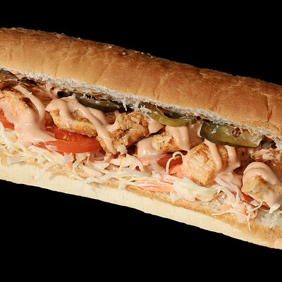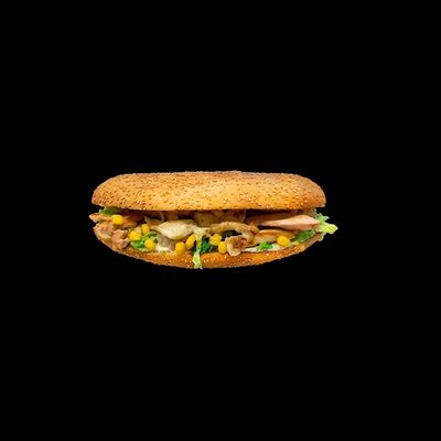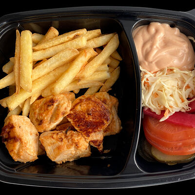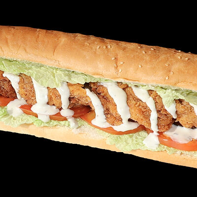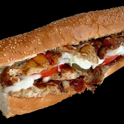 Куриное филе, жаренное на вертеле, свежие помидоры, свежая капуста, солёные огурцы, фирменный чесночный соус, французский багет