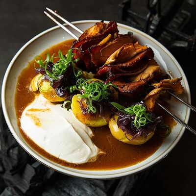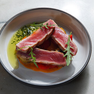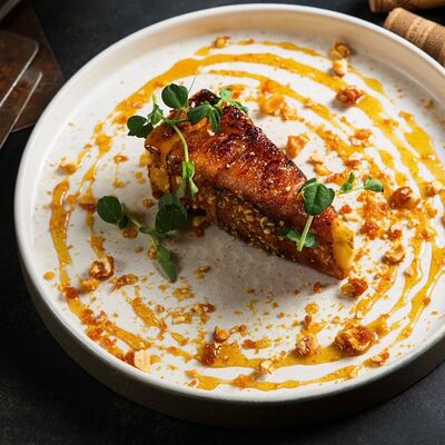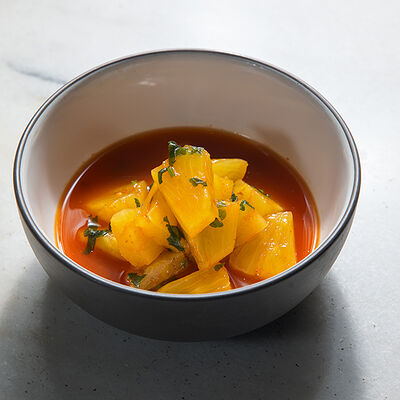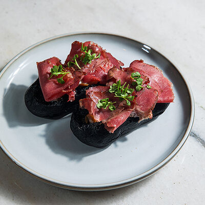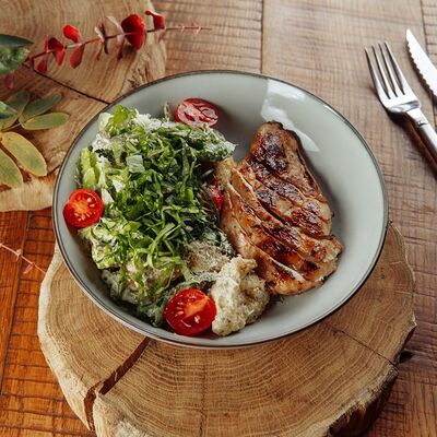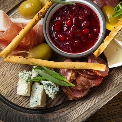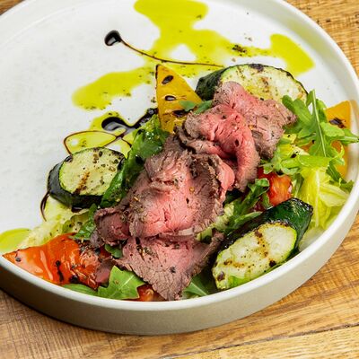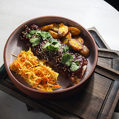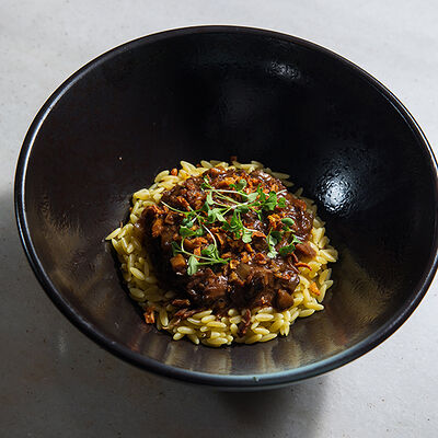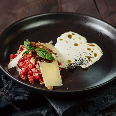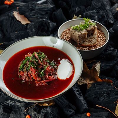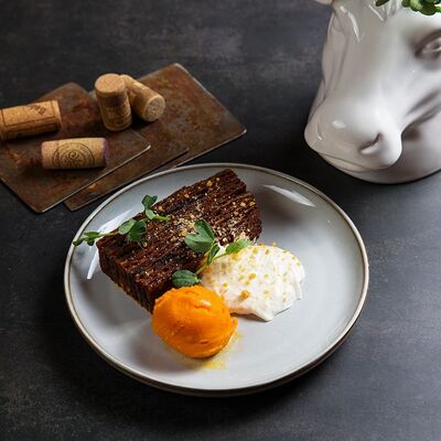 Говядина, сельдерей, морковь, лук репчатый, чеснок, паста томатная, тимьян, специи