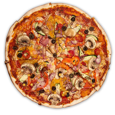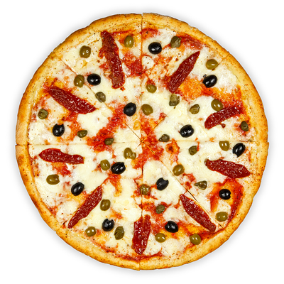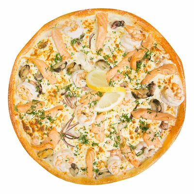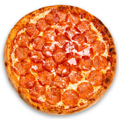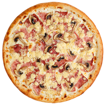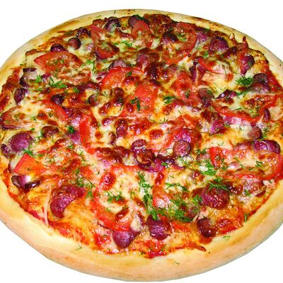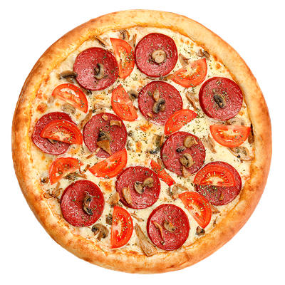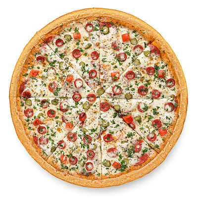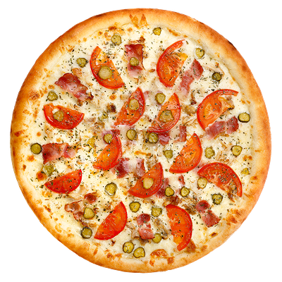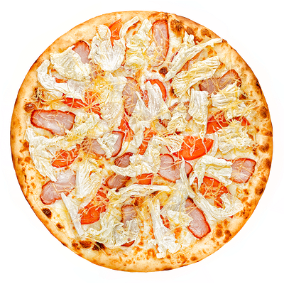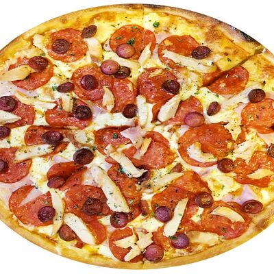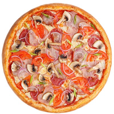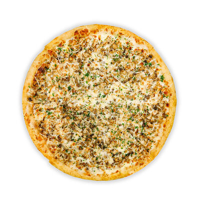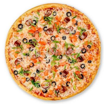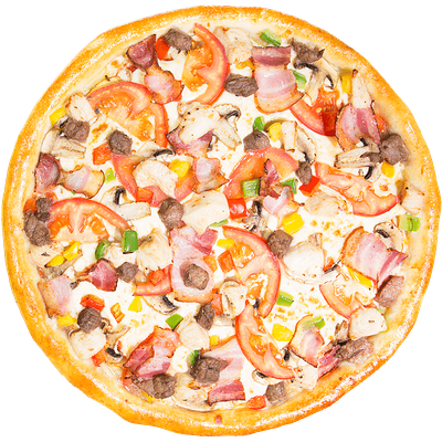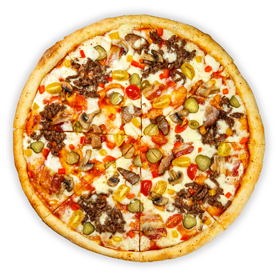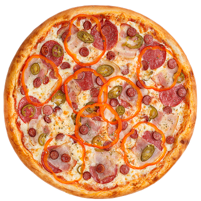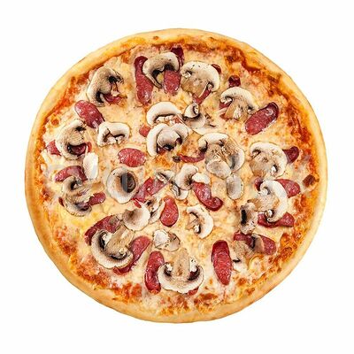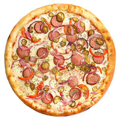 Тонкое тесто, двойная начинка, охотничьи колбаски, сервелат, карбонат, куриное филе, маринованные огурчики, сыр Моцарелла, красный соус, орегано, сливочный соус 30 см