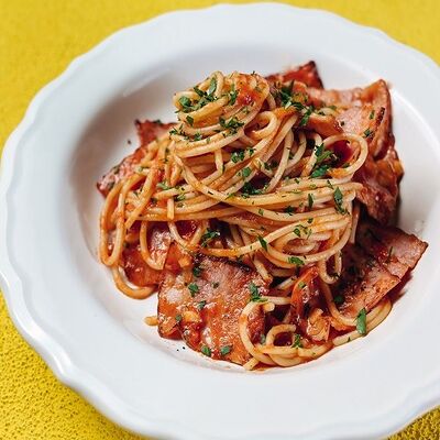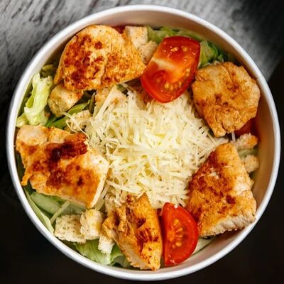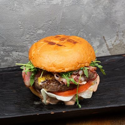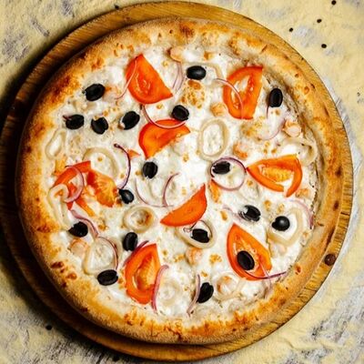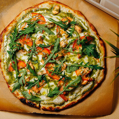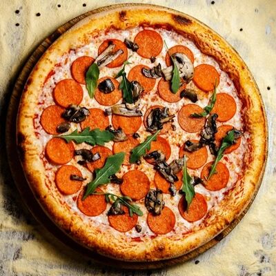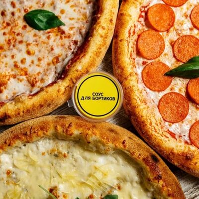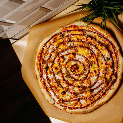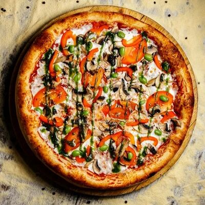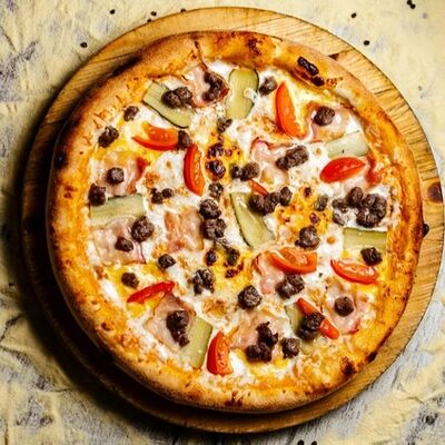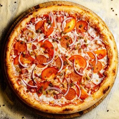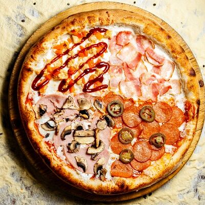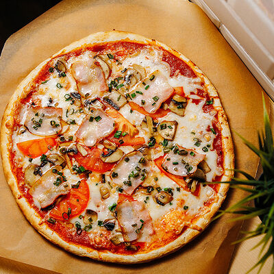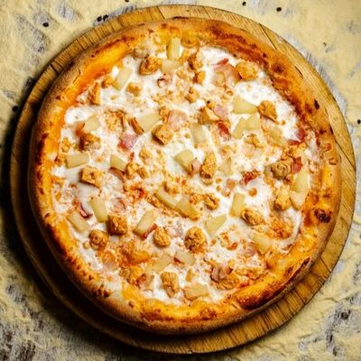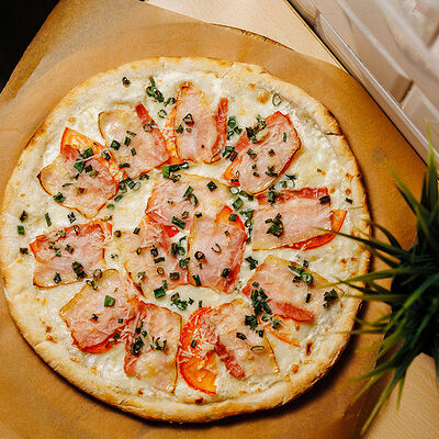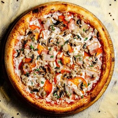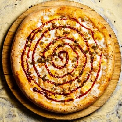 Томатный соус, моцарелла, цыпленок, румяный бекон, шампиньоны, помидоры, лук зелёный, фирменный соус чипотле к бортикам