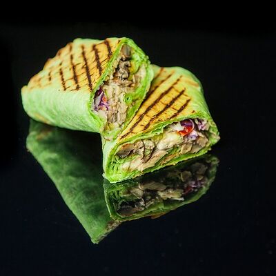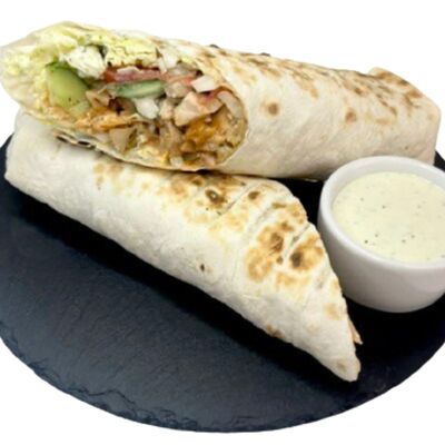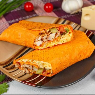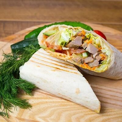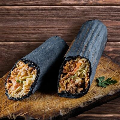 Черный лаваш, свинина, огурцы, помидоры, капуста, морковь, фирменный соус красный, фирменный соус белый