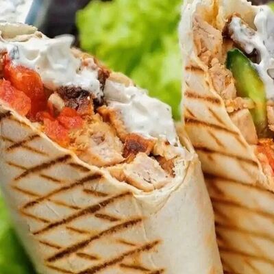 Куриное филе, капуста, морковь, огурец, помидор, чесночный соус, аджика