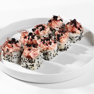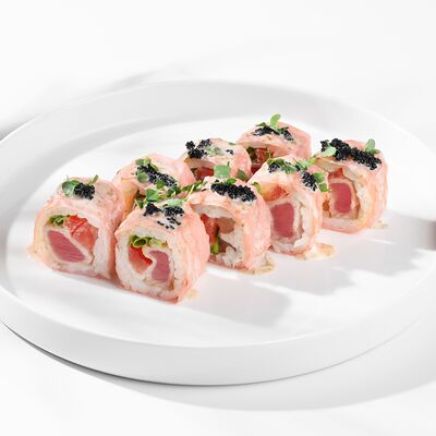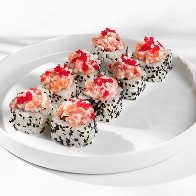 Рис, нори, кунжут, лосось, огурец, сливочный сыр, сырный соус, унаги соус (8 шт.)