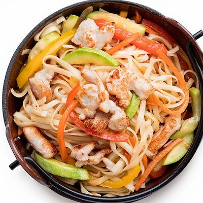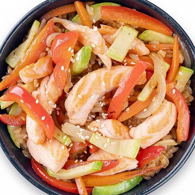 Лапша на выбор, овощной микс, лосось, соус терияки, кунжут, лук зеленый