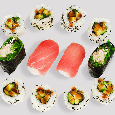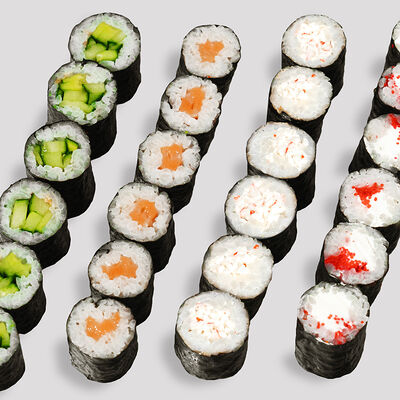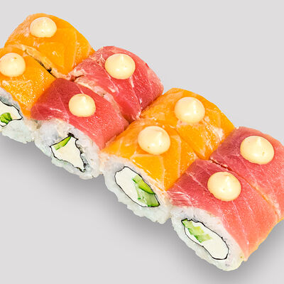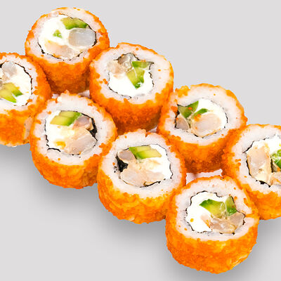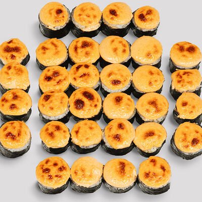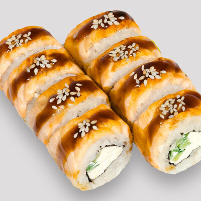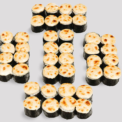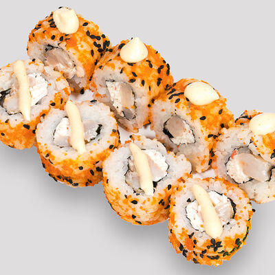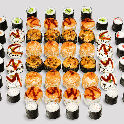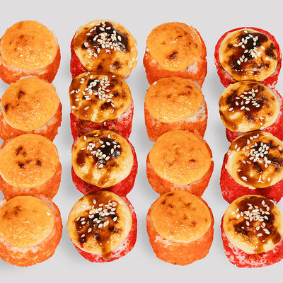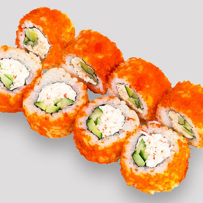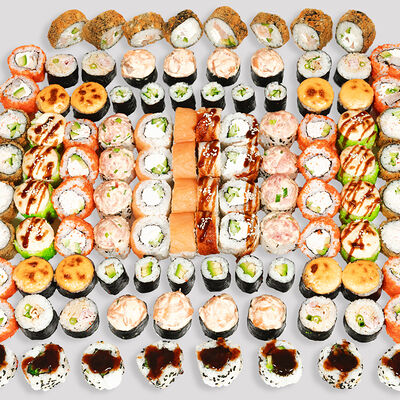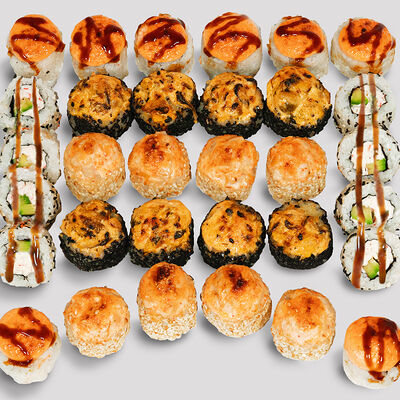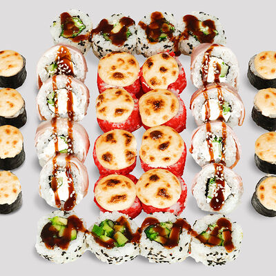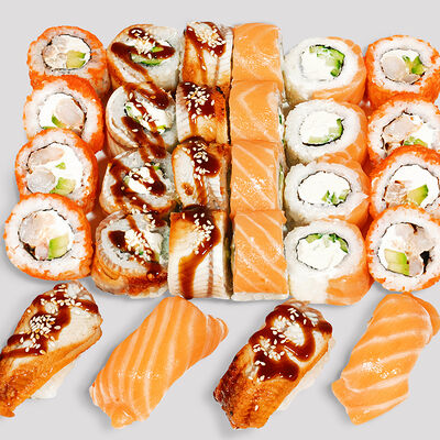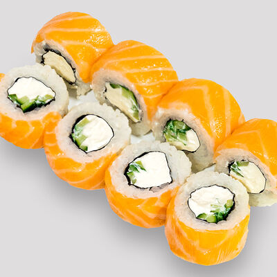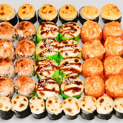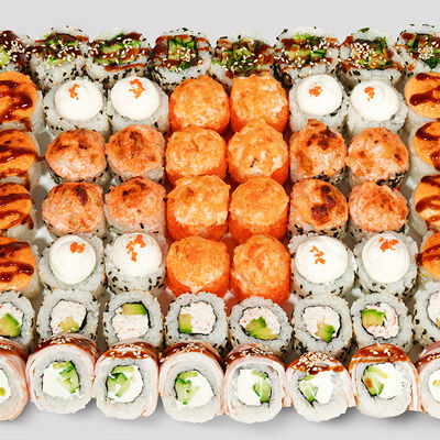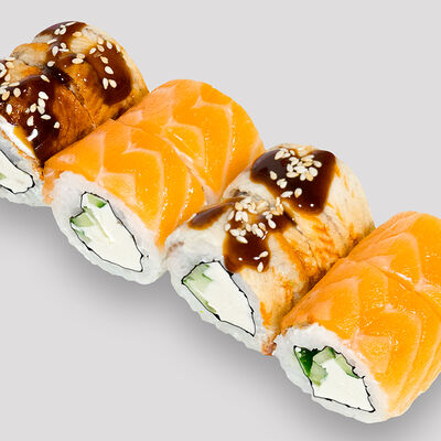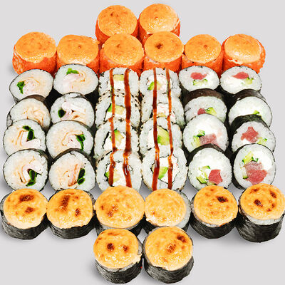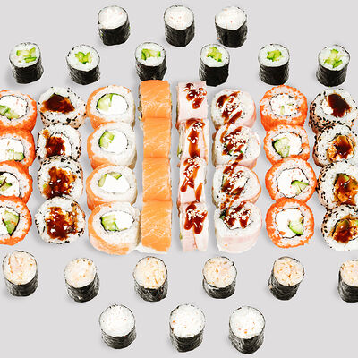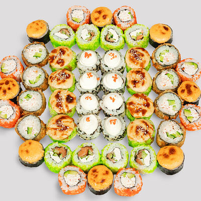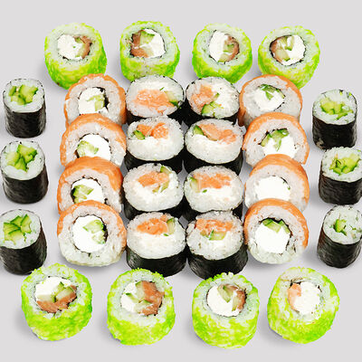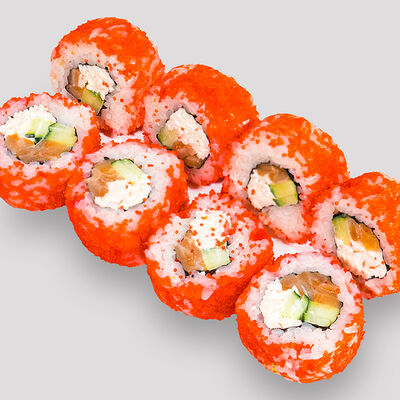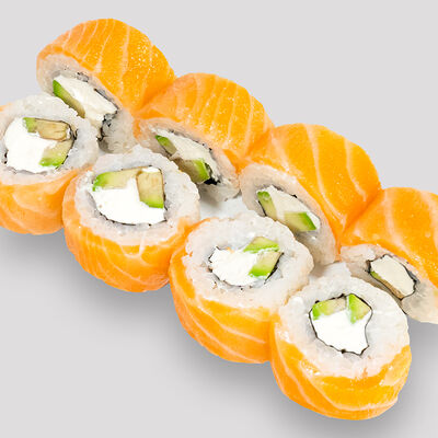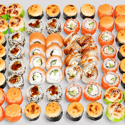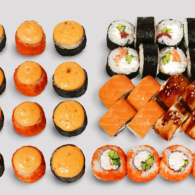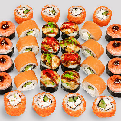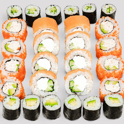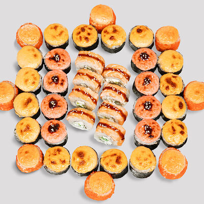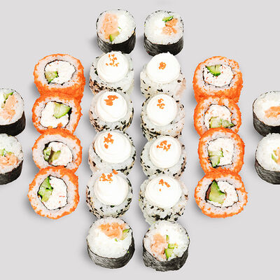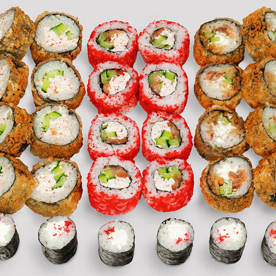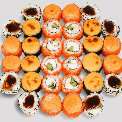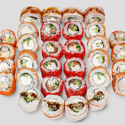 Ролл дабл сырный, ролл дабл хит, ролл филадельфия, ролл калифорния orange, Бесплатно с этим сетом: соевый соус (30 г), имбирь (30 г), васаби (10 г)
