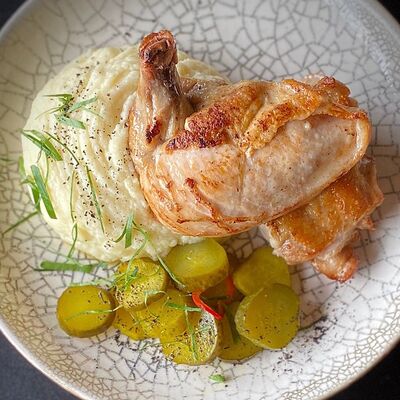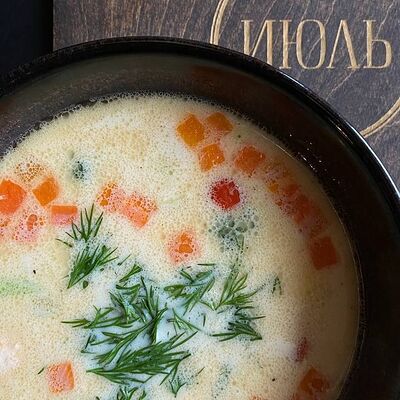 Куриный бульон, морковь, лапша, перепелиные яйца, петрушка, куриные митболы (бедро, сливки, петрушка)