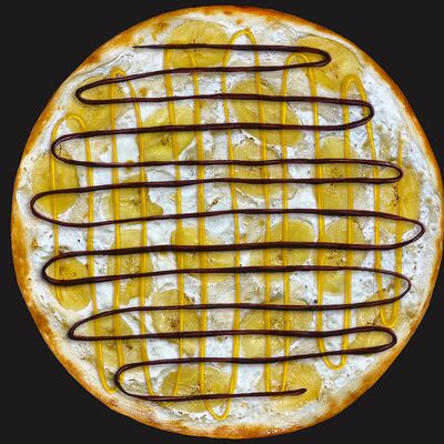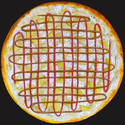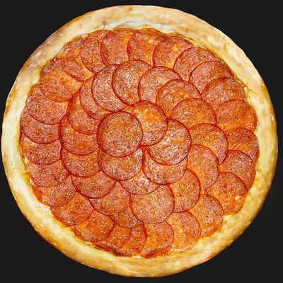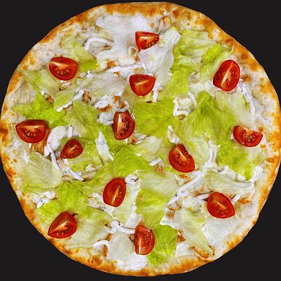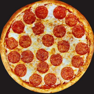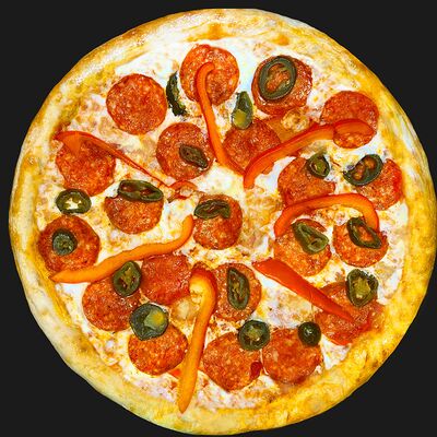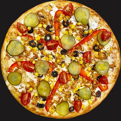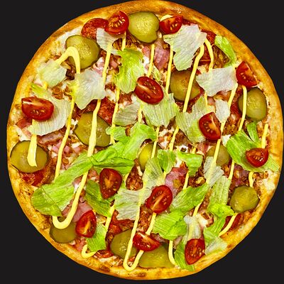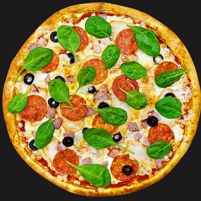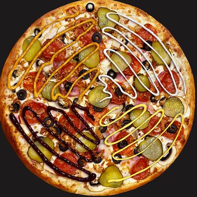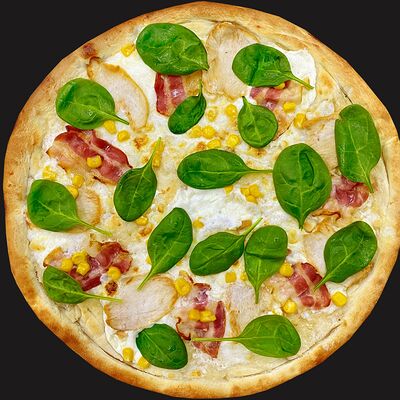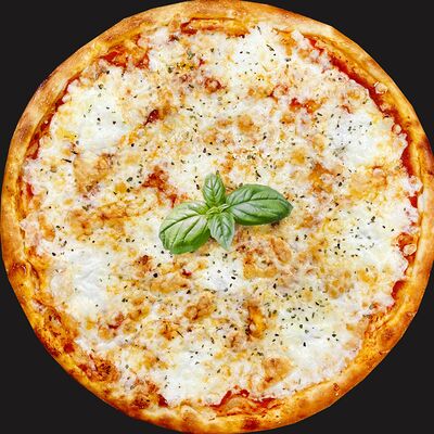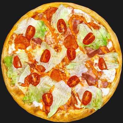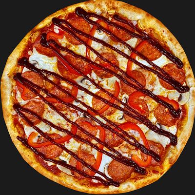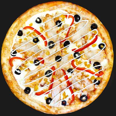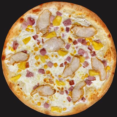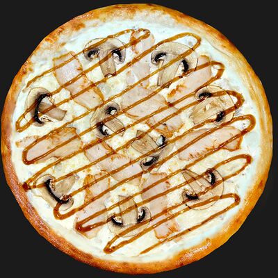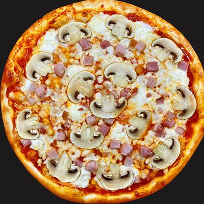 Итальянское тесто, фирменный томатный соус, нежный крем-сыр, сыр моцарелла, фермерская ветчина, шампиньоны, орегано (33 см)