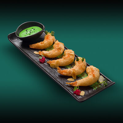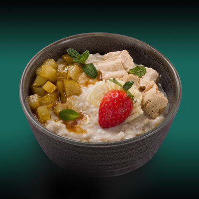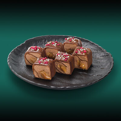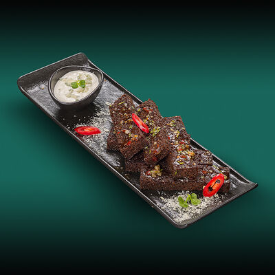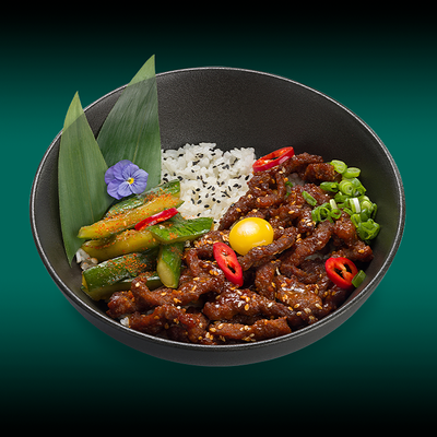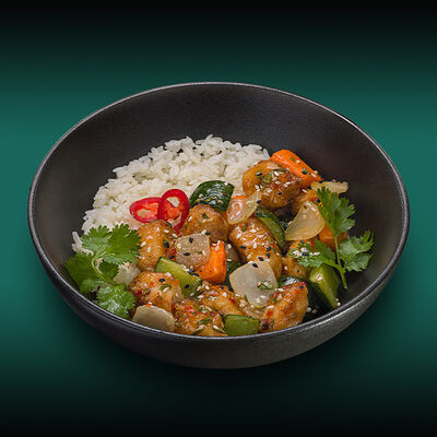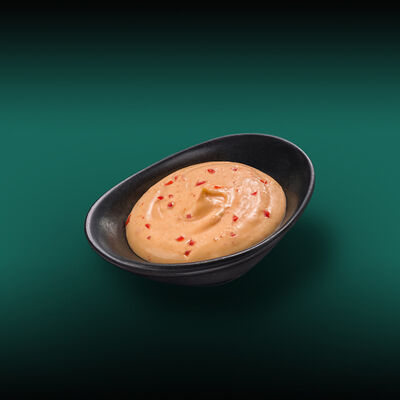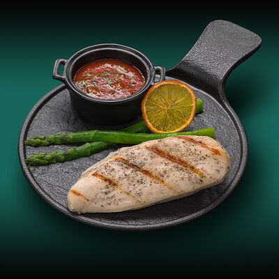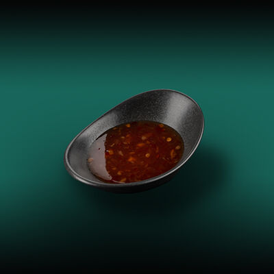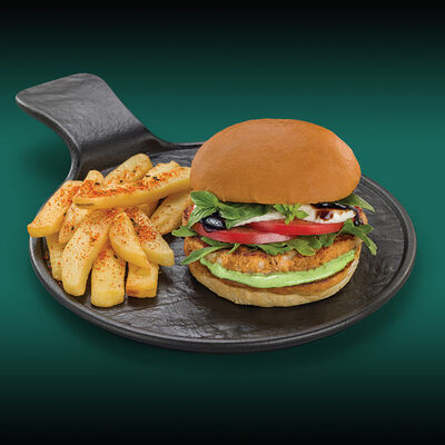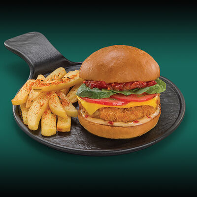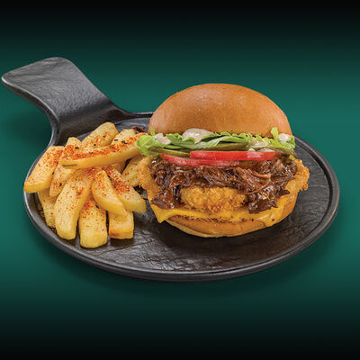 Каштановая булочка с котлетой из куриного филе, сыра моцарелла и халапеньо, сыром чеддер, вареньем из перца чили, салатом романо, томатами и соусом свит чили. Подаётся с картофелем фри со смесью перцев шичими тогараши