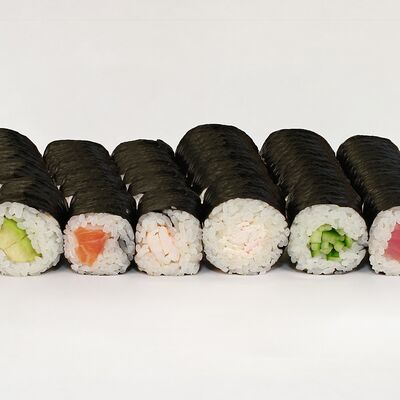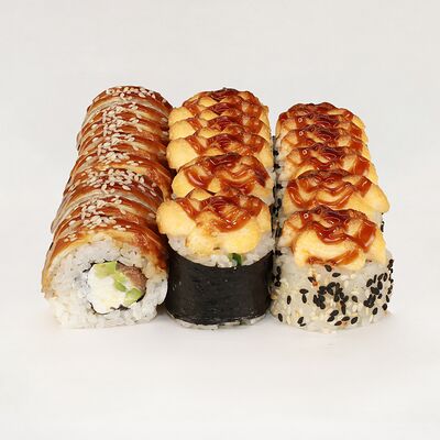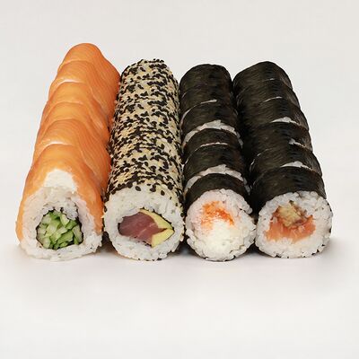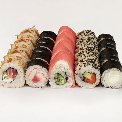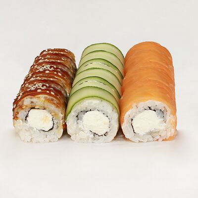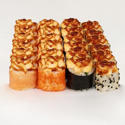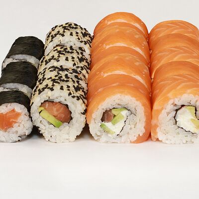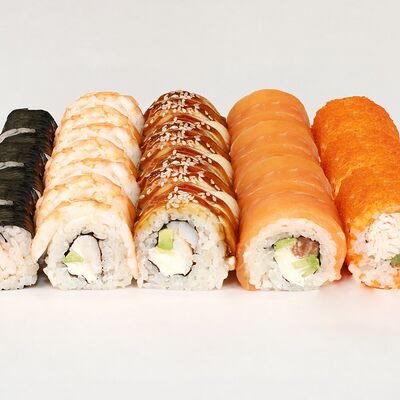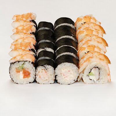 Калифорния классик, Филадельфия, Канада с креветкой, тигр с креветкой, ролл креветкой (30 шт). Имбирь, васаби, соевый соус