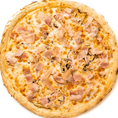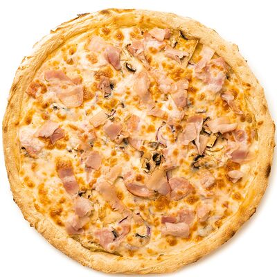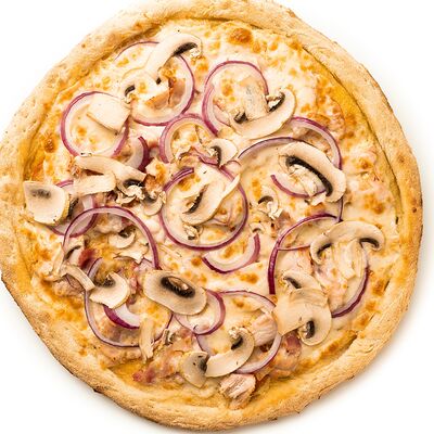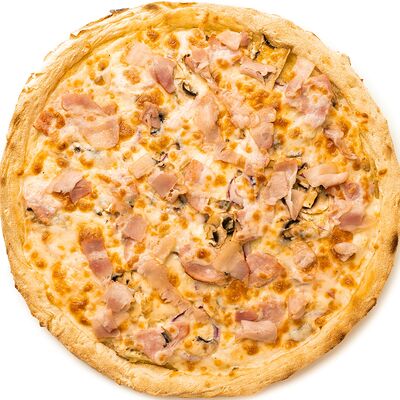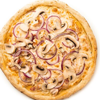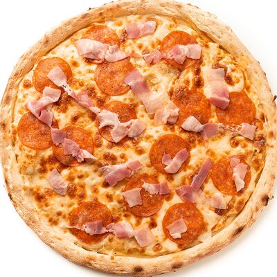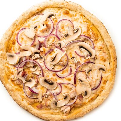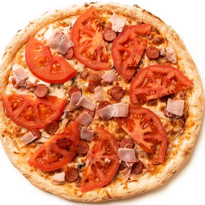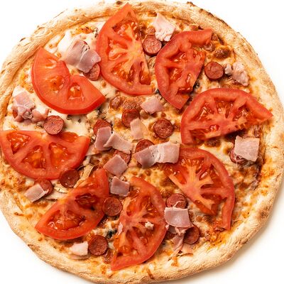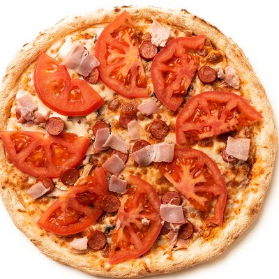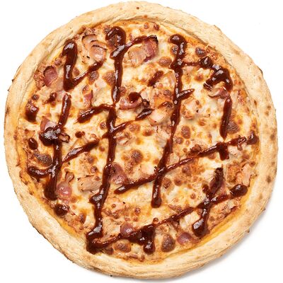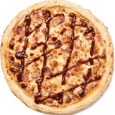 Бекон, цыплёнок, куриные колбаски гриль (халяль), томаты, шампиньоны, моцарелла, соус барбекю, соус чили сладкий, соус томатный (36 см)