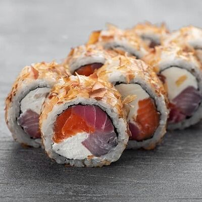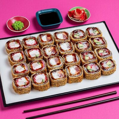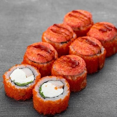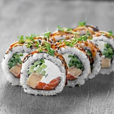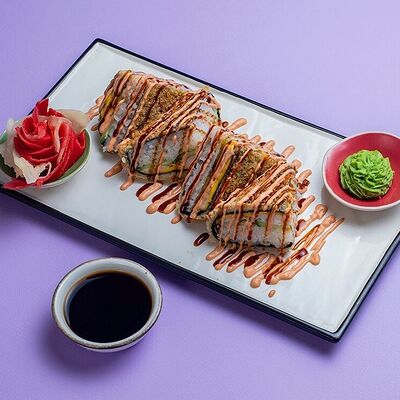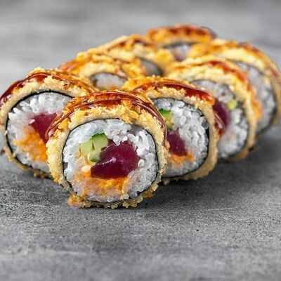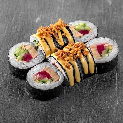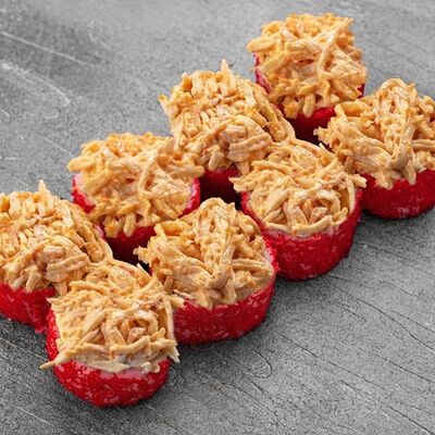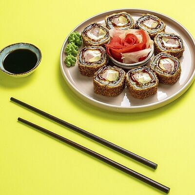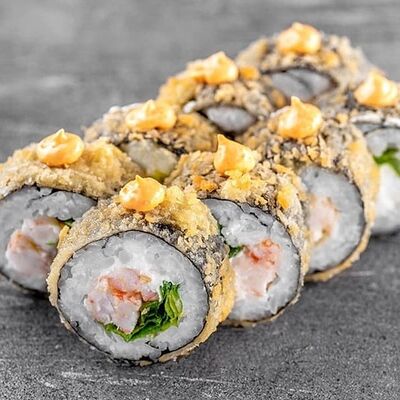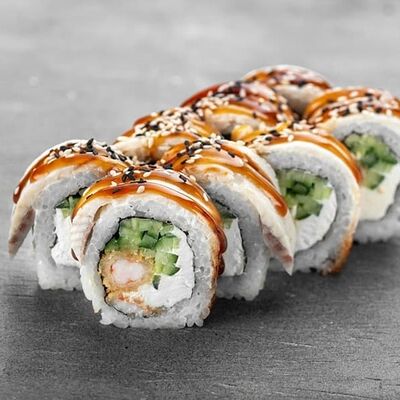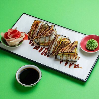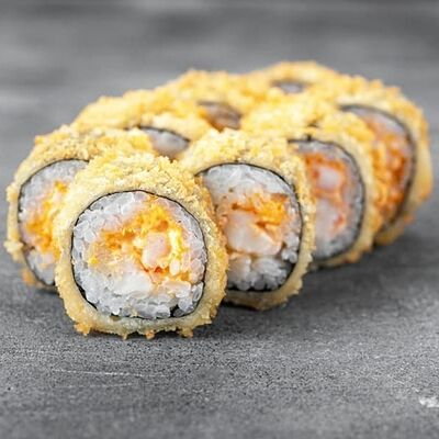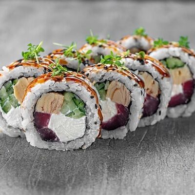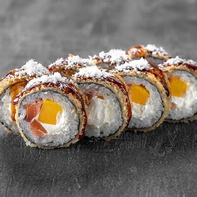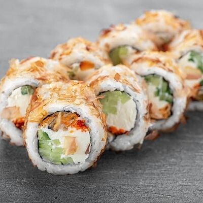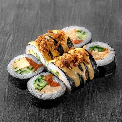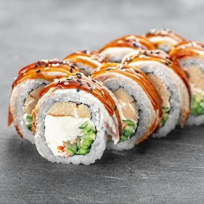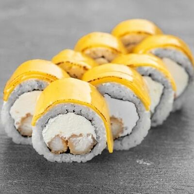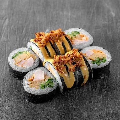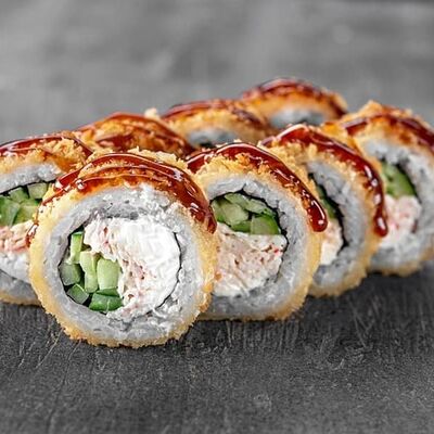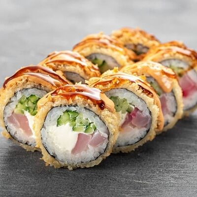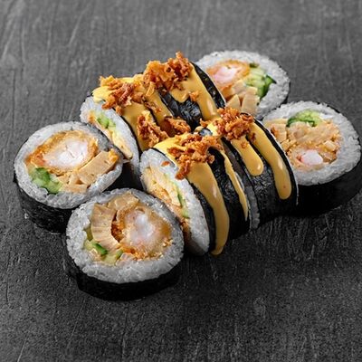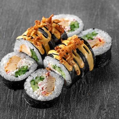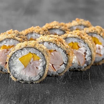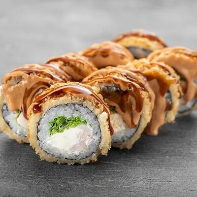 Рис, сыр сremette, копченая курица, лист салата, соус унаги, соус спайси. Если вы любите курицу, то попробуйте его в хрустящем темпурном ролле. Нежное сочетание риса, мягкого сливочного сыра сremette и сочного листа салата изящно подчёркивает вкус курицы со сладким унаги-соусом
