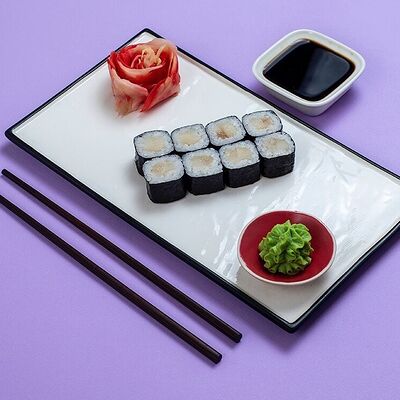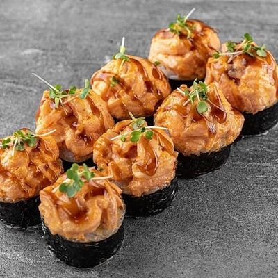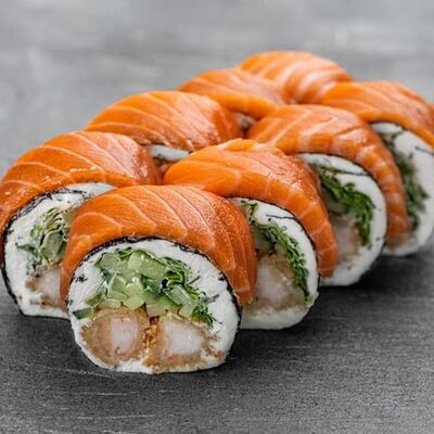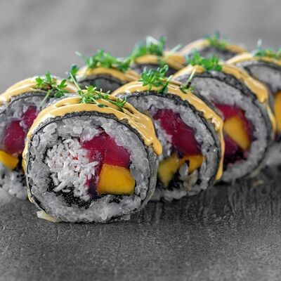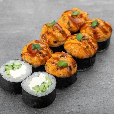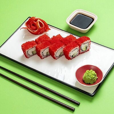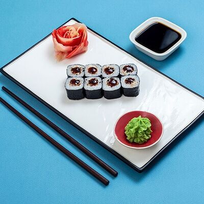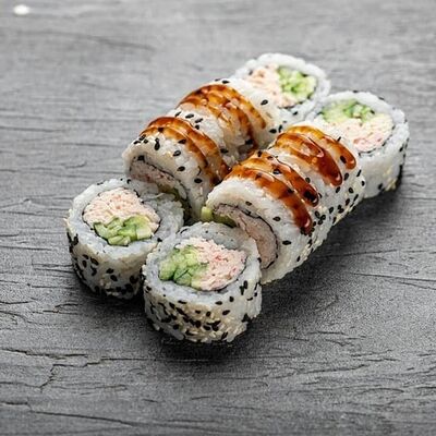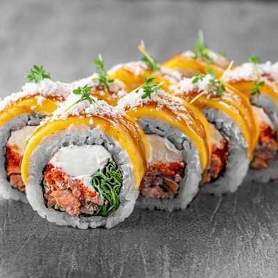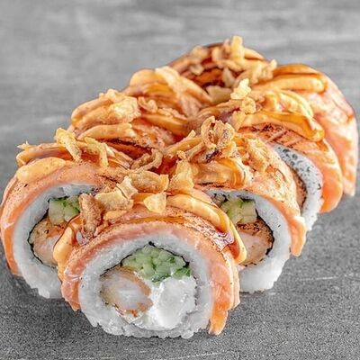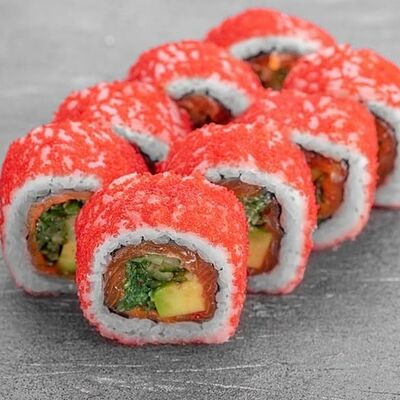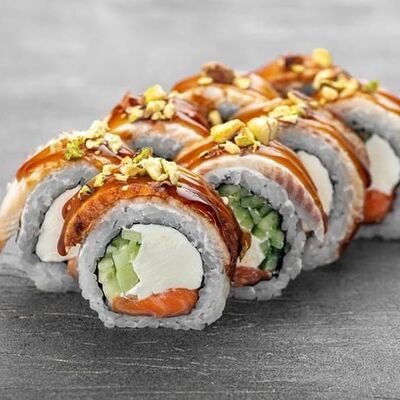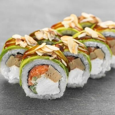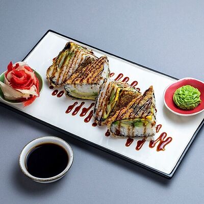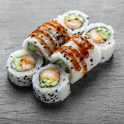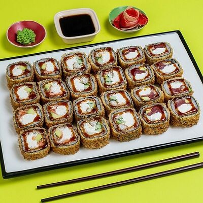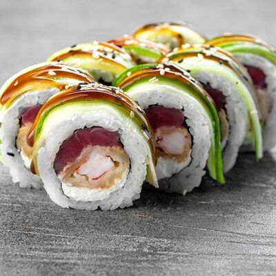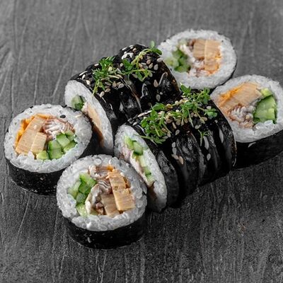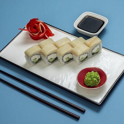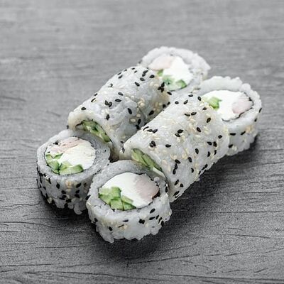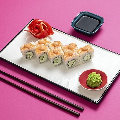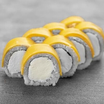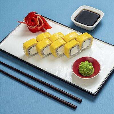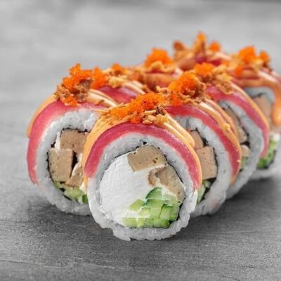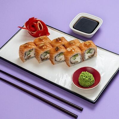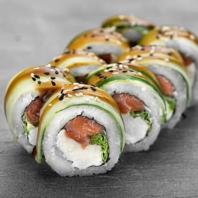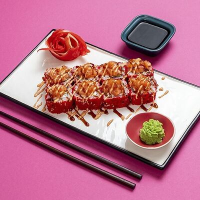 Рис, сыр сremette, копченая курица, лист салата, соус унаги, соус спайси. Если вы любите курицу, то попробуйте его в хрустящем темпурном ролле. Нежное сочетание риса, мягкого сливочного сыра сremette и сочного листа салата изящно подчёркивает вкус курицы со сладким унаги-соусом