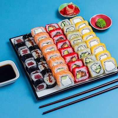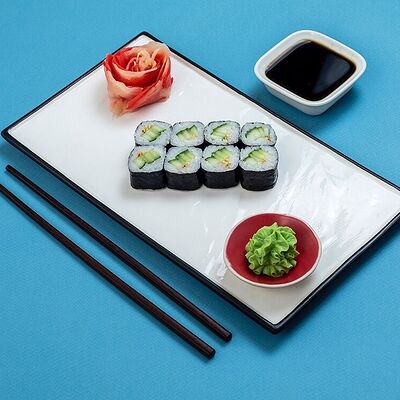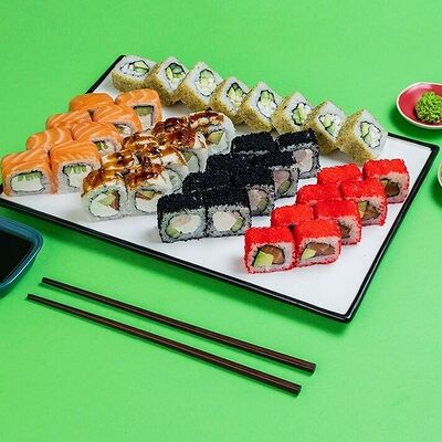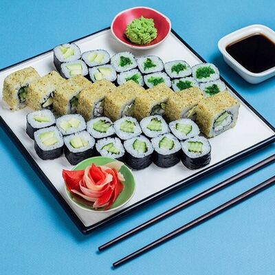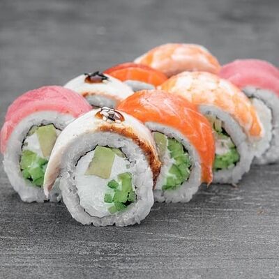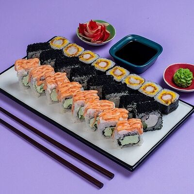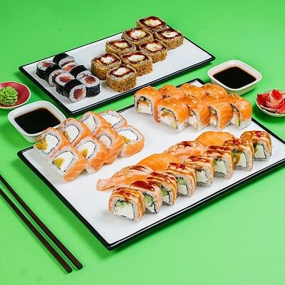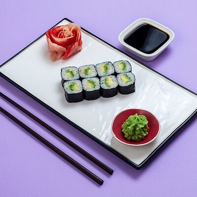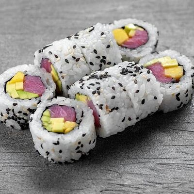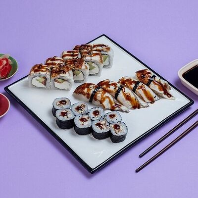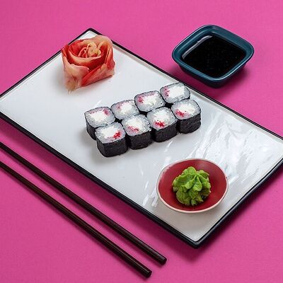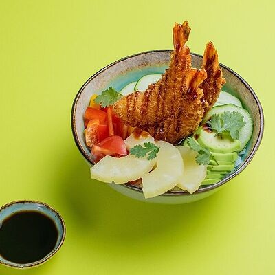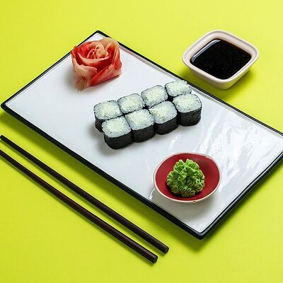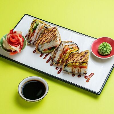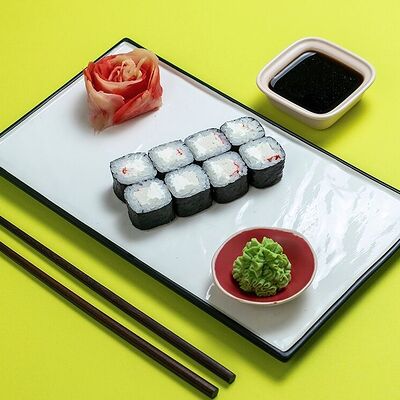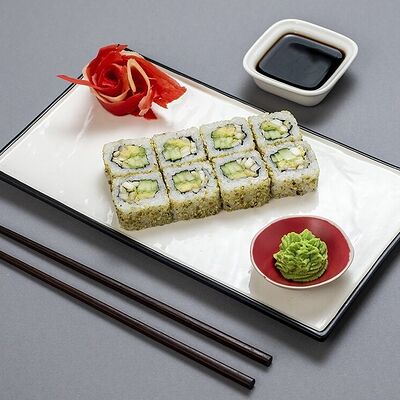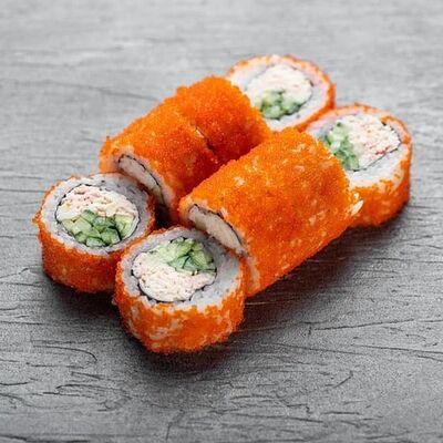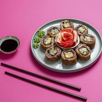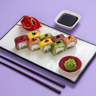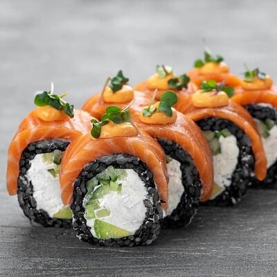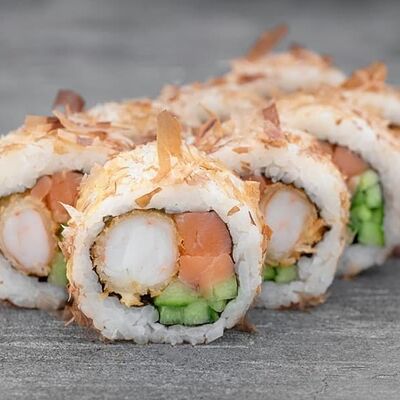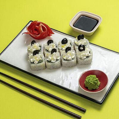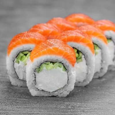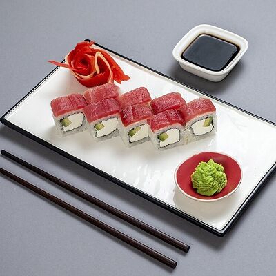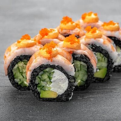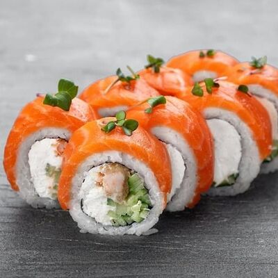Рис, сыр сremette, копченая курица, лист салата, соус унаги, соус спайси. Если вы любите курицу, то попробуйте его в хрустящем темпурном ролле. Нежное сочетание риса, мягкого сливочного сыра сremette и сочного листа салата изящно подчёркивает вкус курицы со сладким унаги-соусом