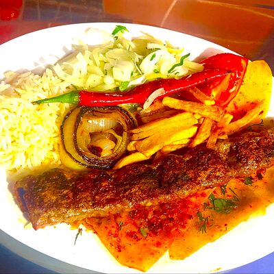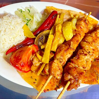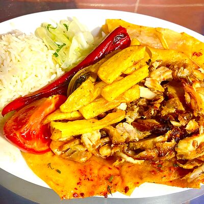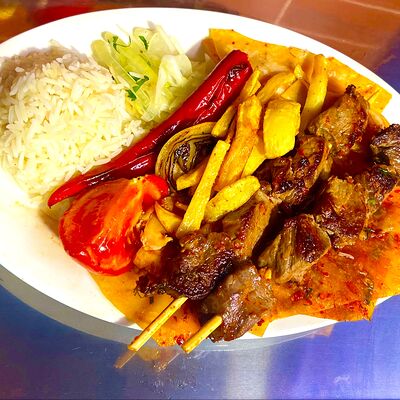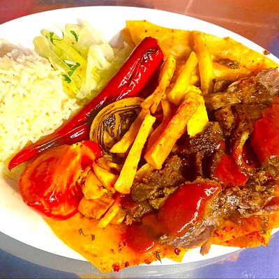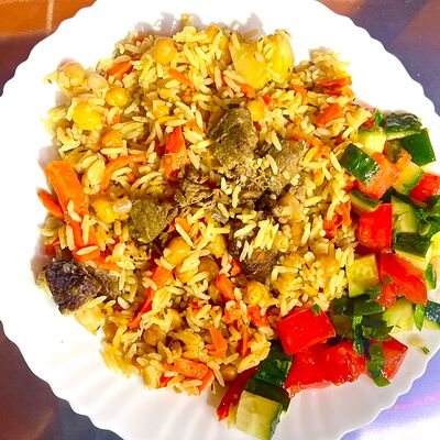Баранина, рис, огурец солёный, лепёшка, томатный соус, помидор, картошка жареная
