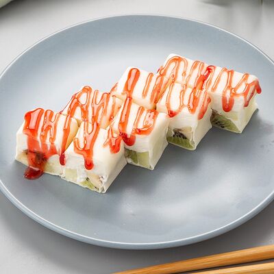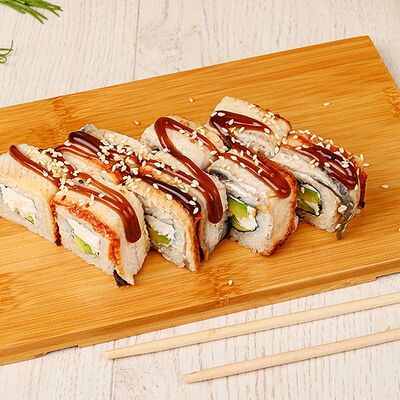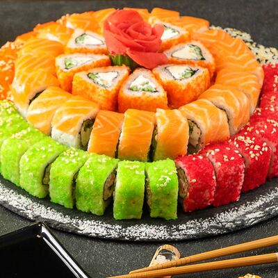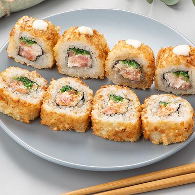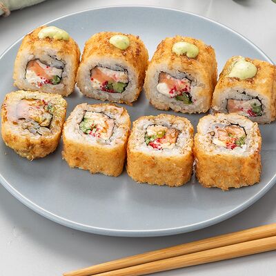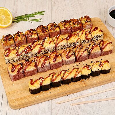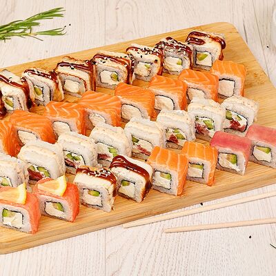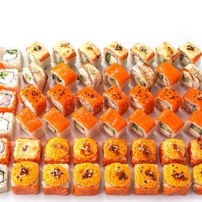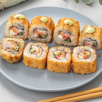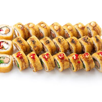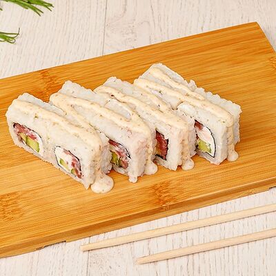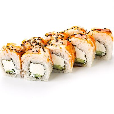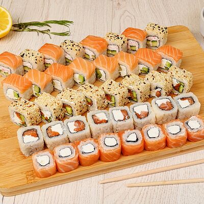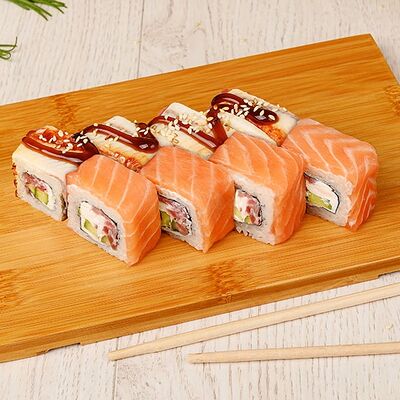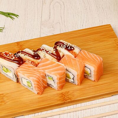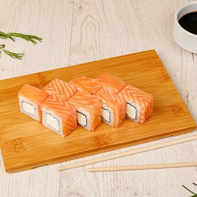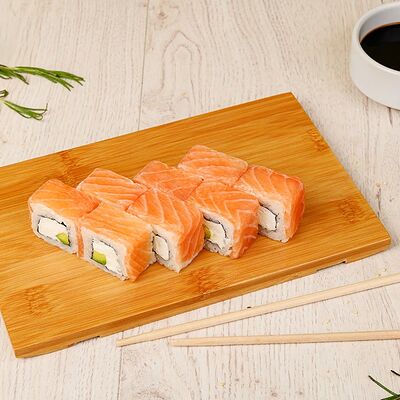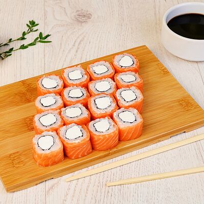 Филавчики (лосось, сливочный сыр), Филадельфия (лосось, сливочный сыр, огурец), Филадельфия роял (лосось, сливочный сыр, огурец, кунжут), Филадельфия крабс (лосось, снежный краб, огурец, белый соус, кунжут), Нежный лосось (лосось, сливочный сыр)