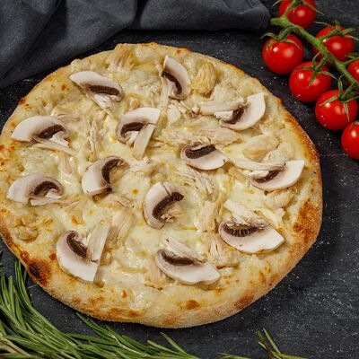 Тесто для пиццы, сырный соус, сыр моцарелла, курица, грибы шампиньоны