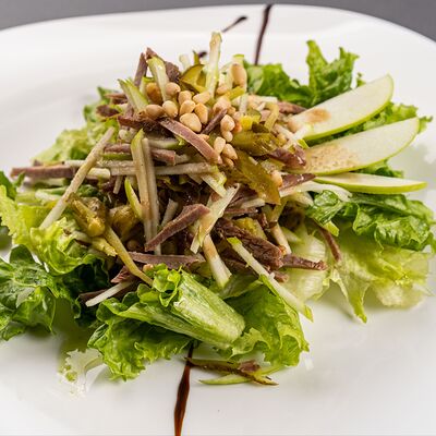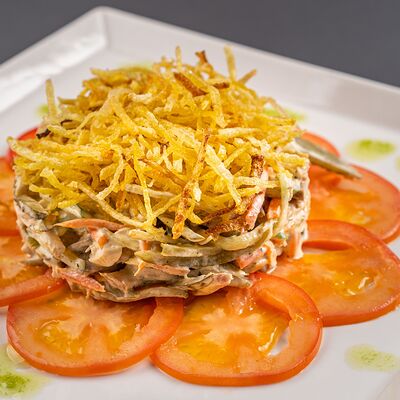 Нежный говяжий язык, курочка терияки, огурец маринованный, огурец свежий. Заправлен майонезом и обильно посыпан картофелем пай