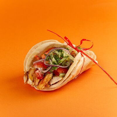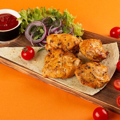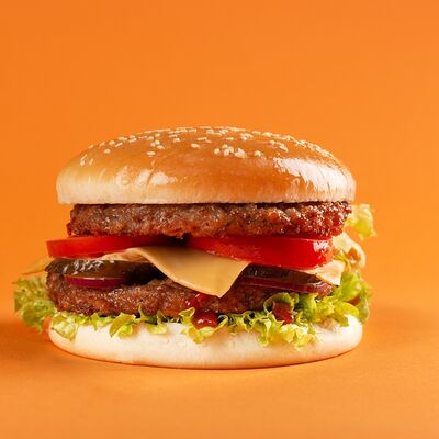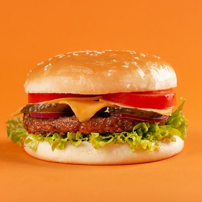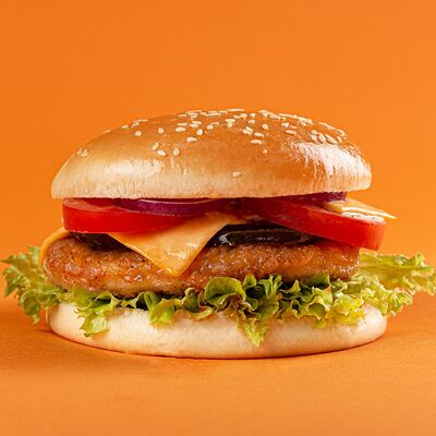 Куриная котлета, айсберг, томаты, соленые огурцы, лук, сыр чеддер, соус гриль, бургерный соус