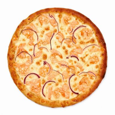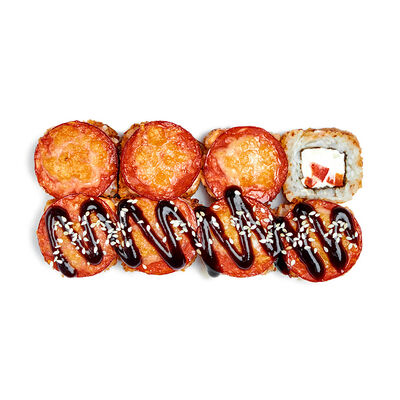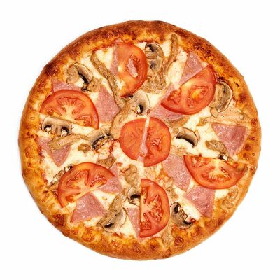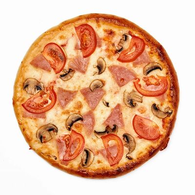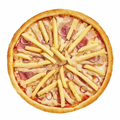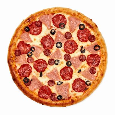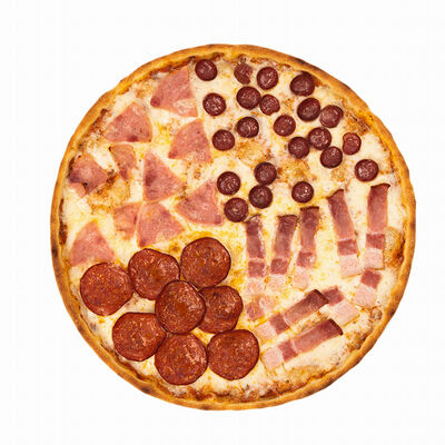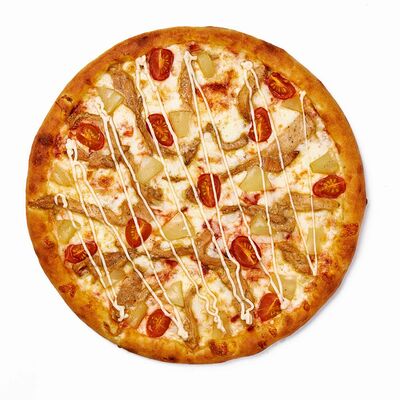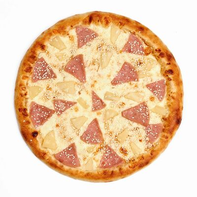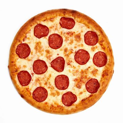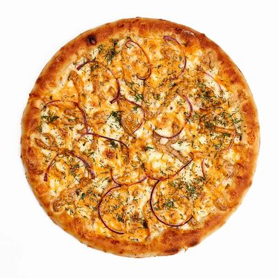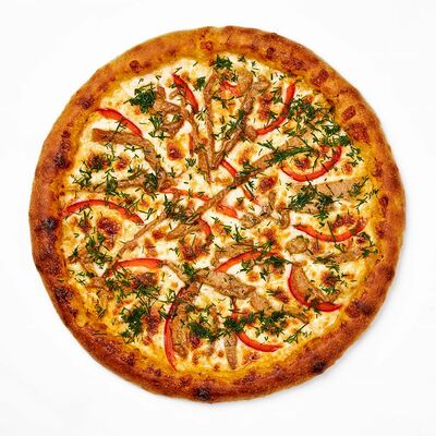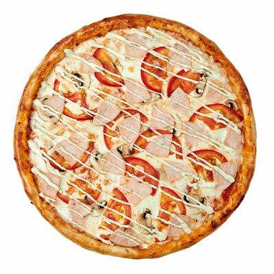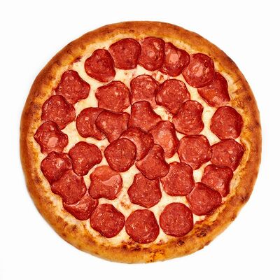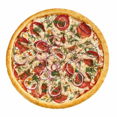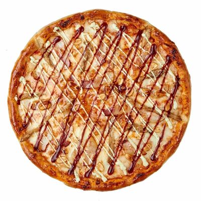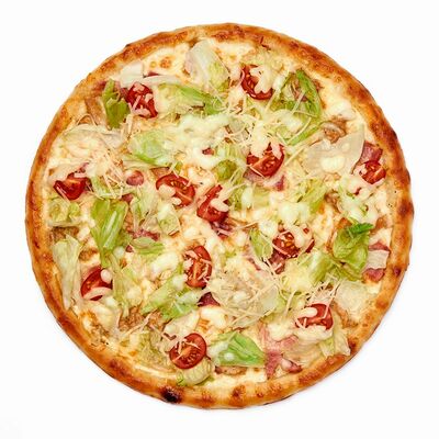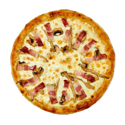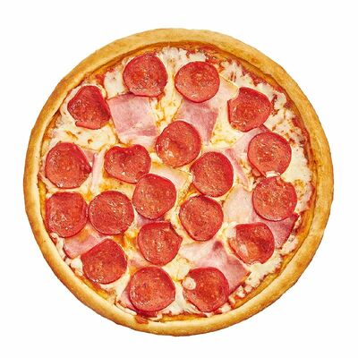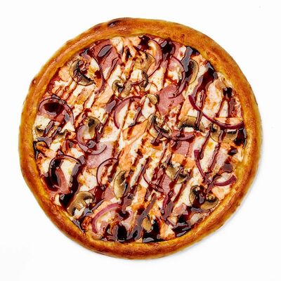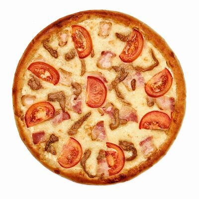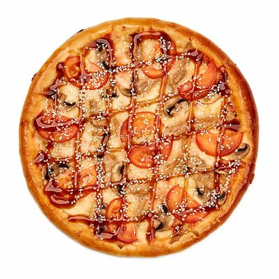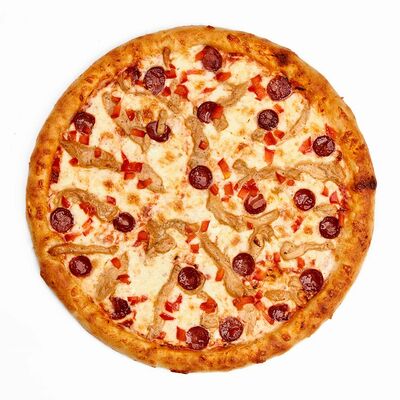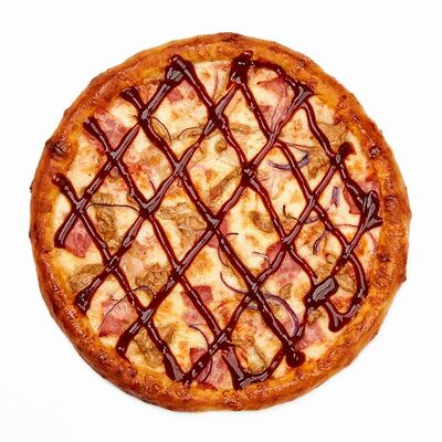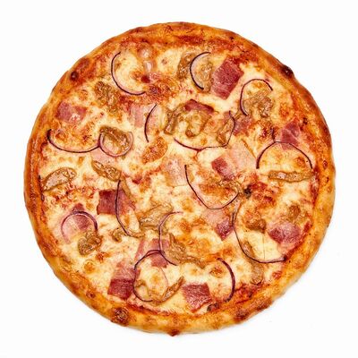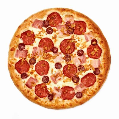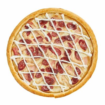 Тесто тонкое, томатный соус, шрирача-соус, сыр моцарелла, пепперони, бекон (28 см)
