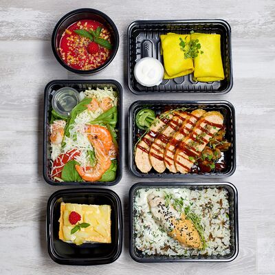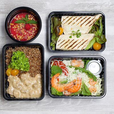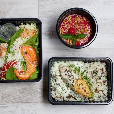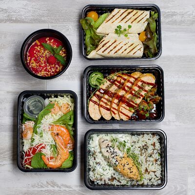 В составе 6 блюд. Каша овсяная с клубничным джемом, орехами и чиа. Творожное суфле с ананасами и цукатами. Куриный кебаб с бурым рисом и грибным соусом. Блинчики с творожным сыром и курочкой. Куриный рулет с грибами и соусом BBQ. Салат с тигровыми креветками и пармезаном