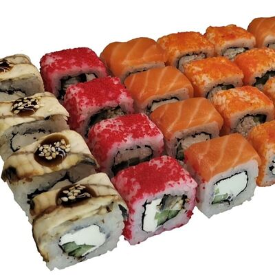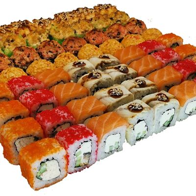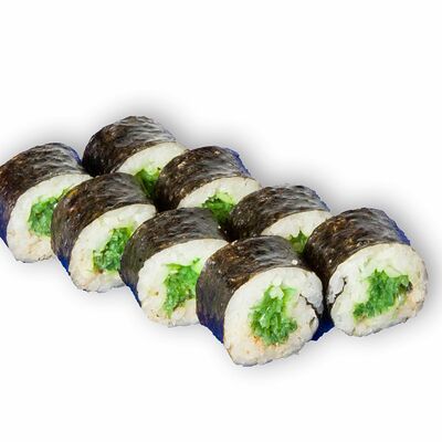 Мидии, масаго, соус яки, сыр сливочный, огурцы, соевый соус (30 г), имбирь (30 г), васаби (10 г)