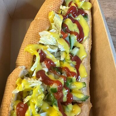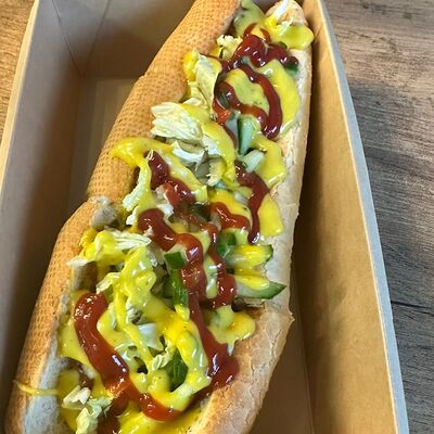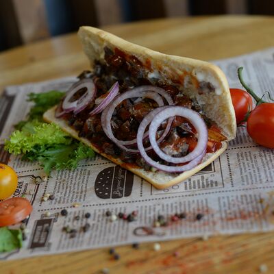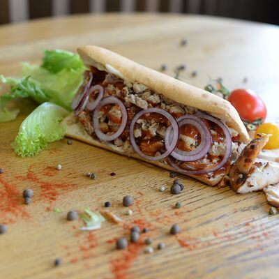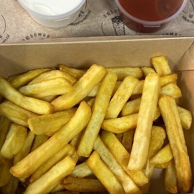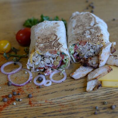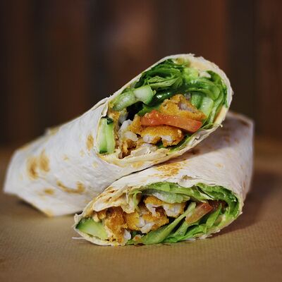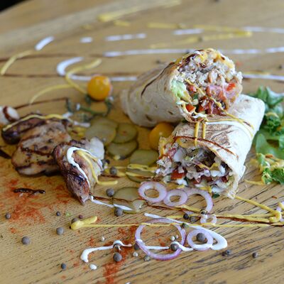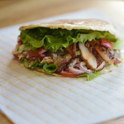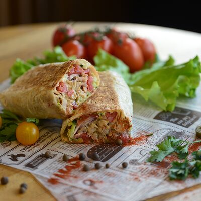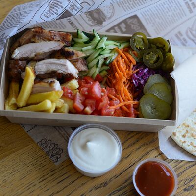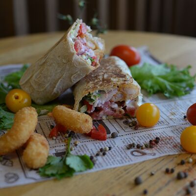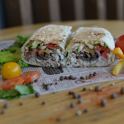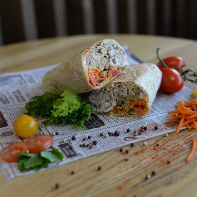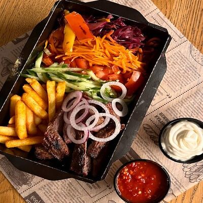 Лаваш классический, курица на углях, помидоры, огурцы свежие, салат айсберг, лук красный, соус чесночный, картофель фри, морковь по-корейски