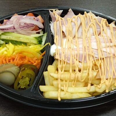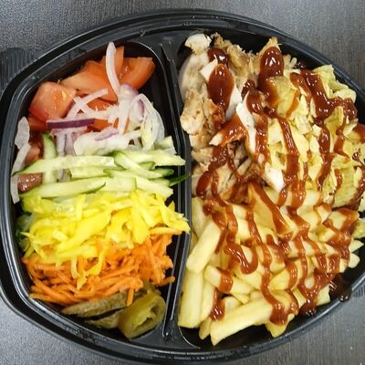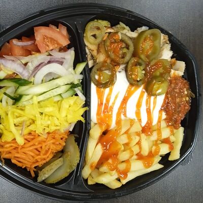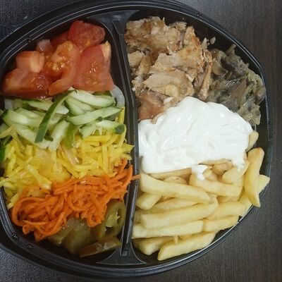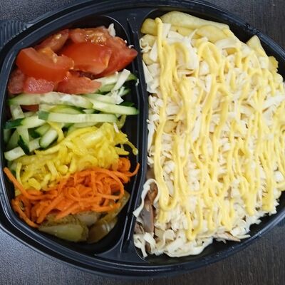 Помидоры свежие, огурцы свежие, капуста пекинская, мясо куриное, соус Чесночный, грибы Шампиньоны, жаренные с луком, лаваш