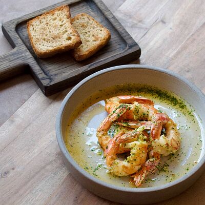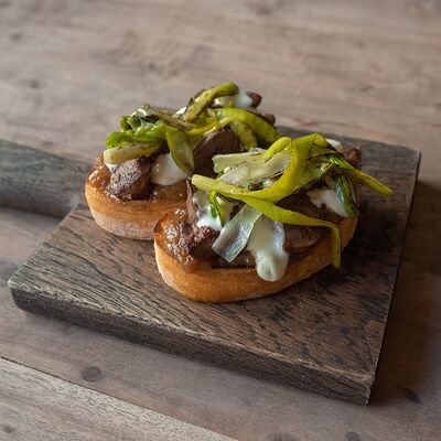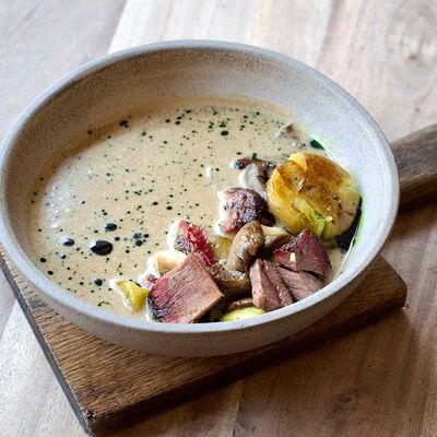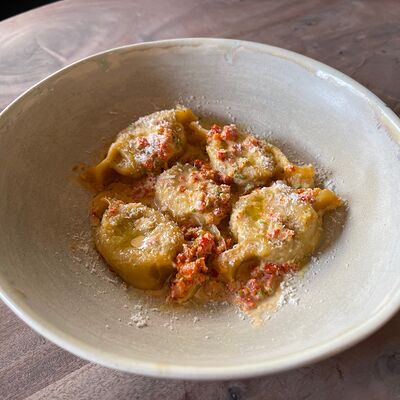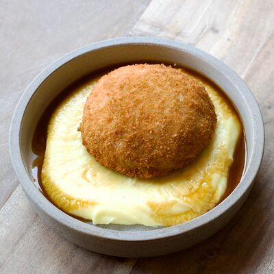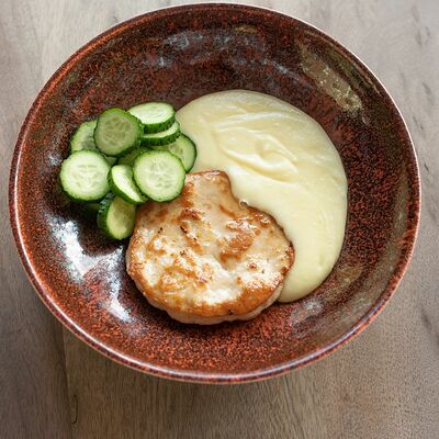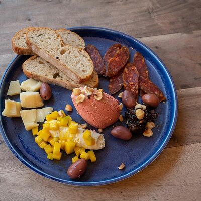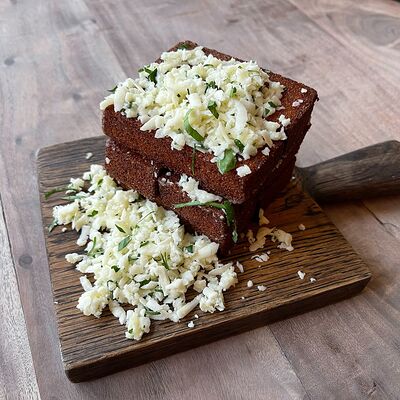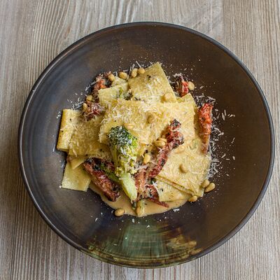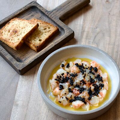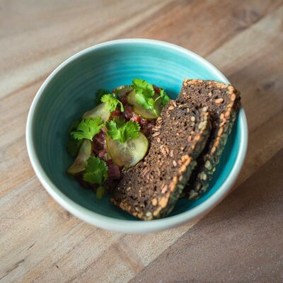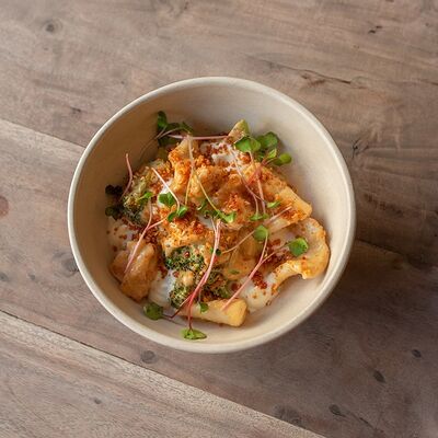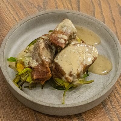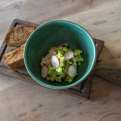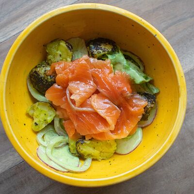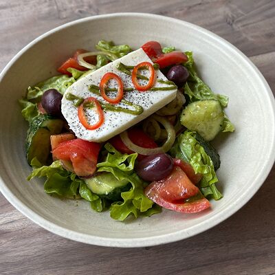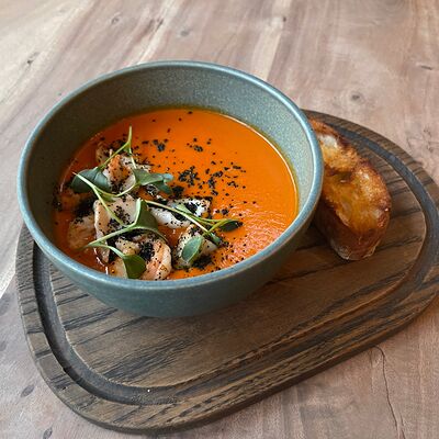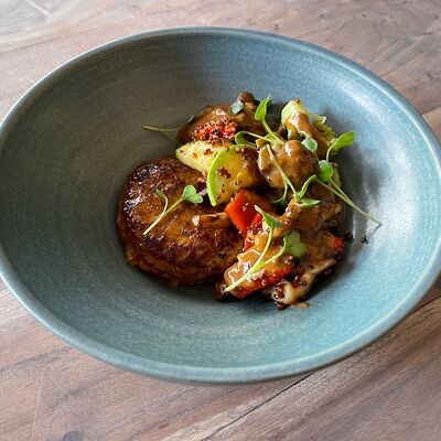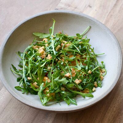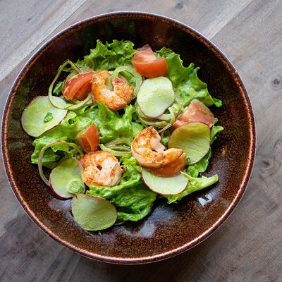 Кальмар, помидоры, цукини, руккола, перечная заправка, масло для креветок, жареная крошка из лукового хлеба, соль, перец
