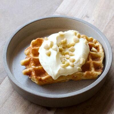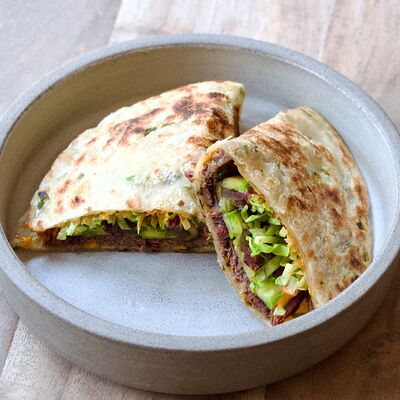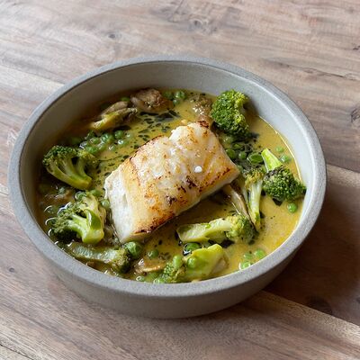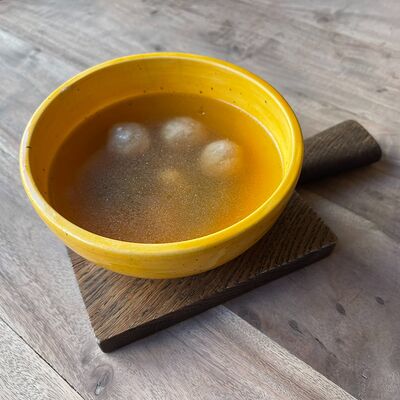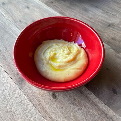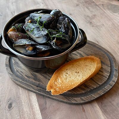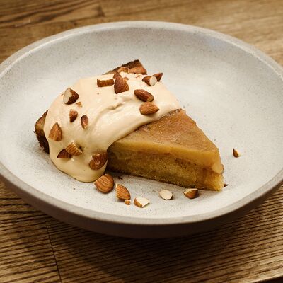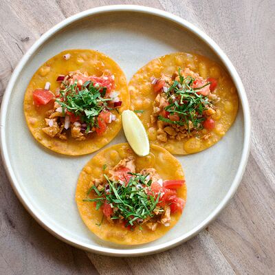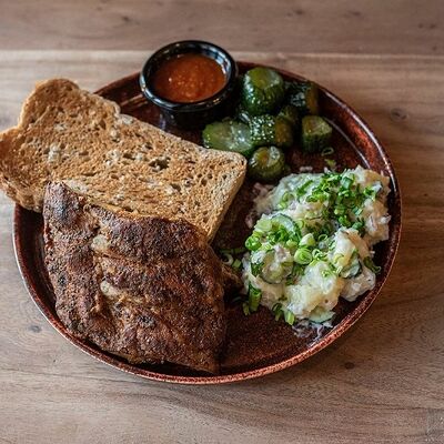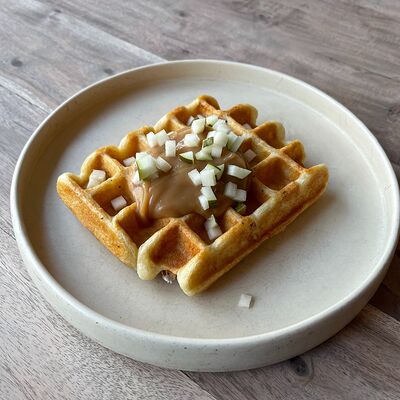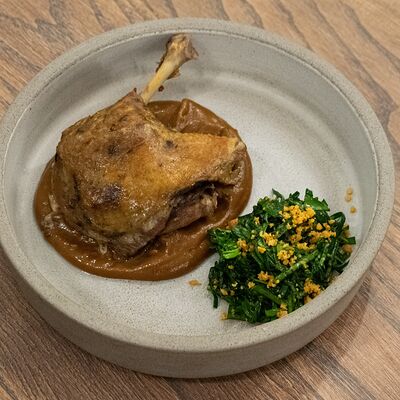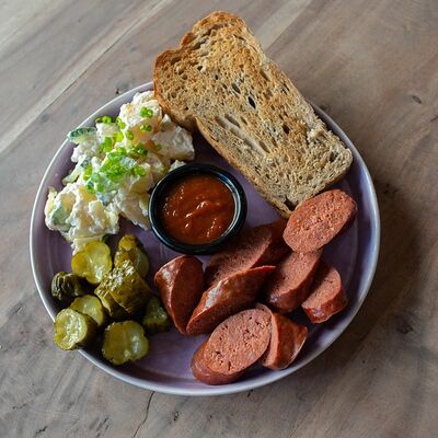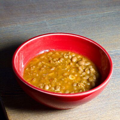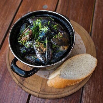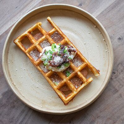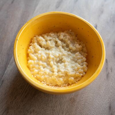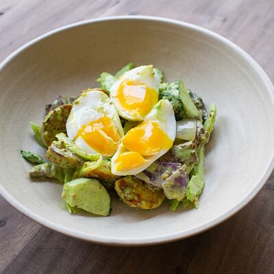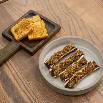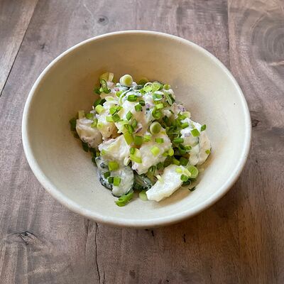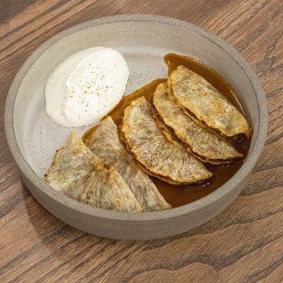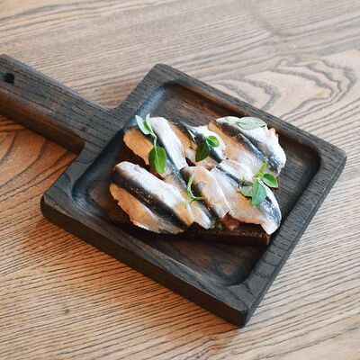 Кальмар, помидоры, цукини, руккола, перечная заправка, масло для креветок, жареная крошка из лукового хлеба, соль, перец