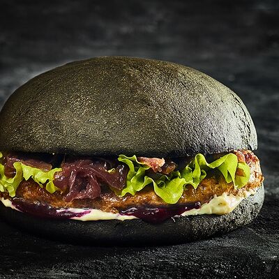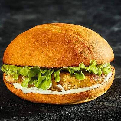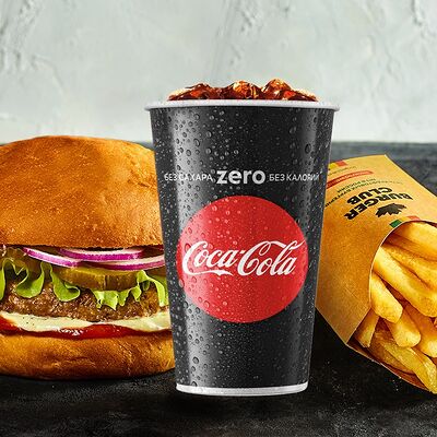 Большая и сочная котлета из мраморной говядины блэк ангус, свежеиспеченная воздушная булочка, хрустящие маринованные огурчики и красный лук, свежий лист салата, соусы на натуральной основе