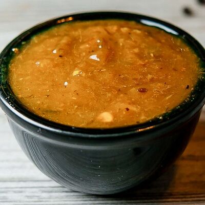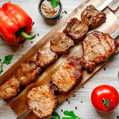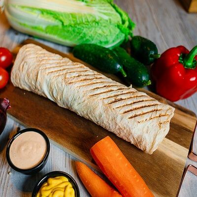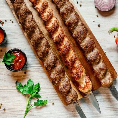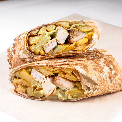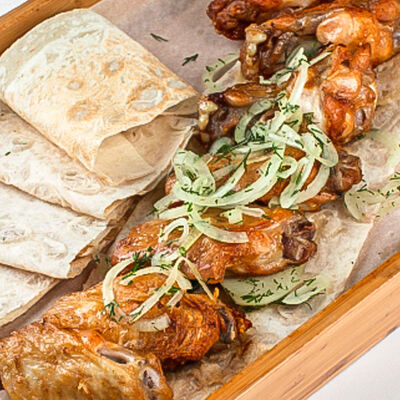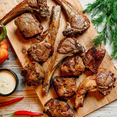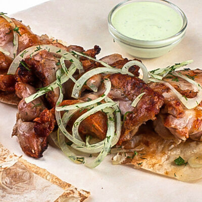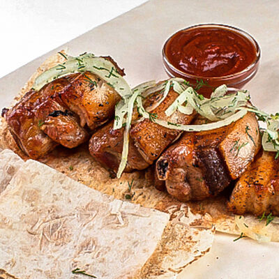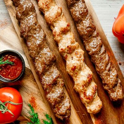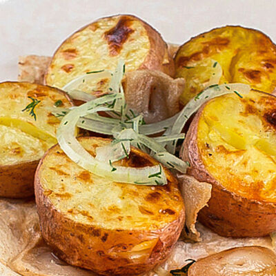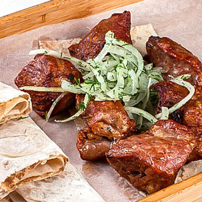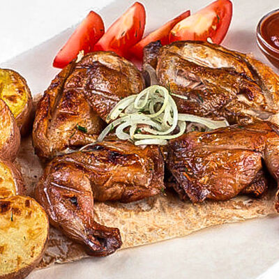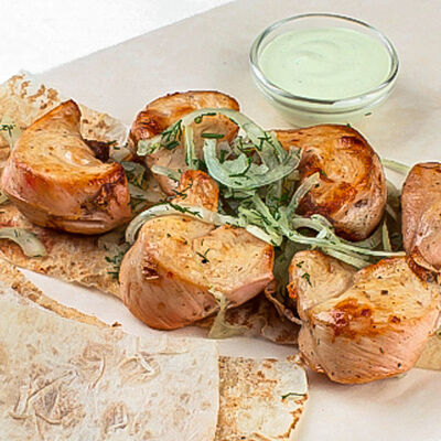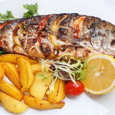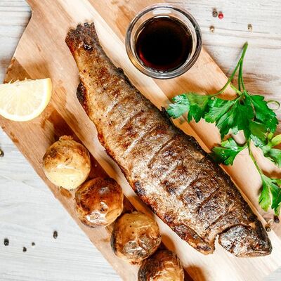 Рыба Сибас (350 г), пожаренная на мангале, подается с картофелем (240 г), лимоном и соусом наршараб
