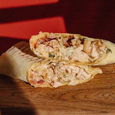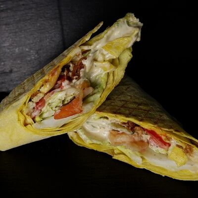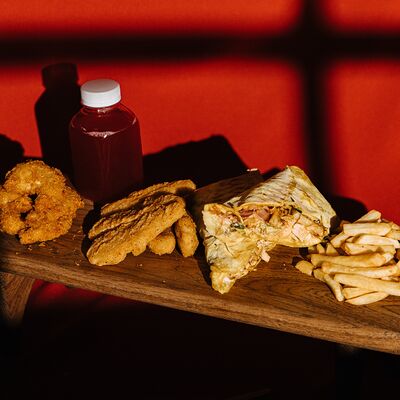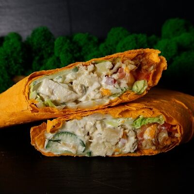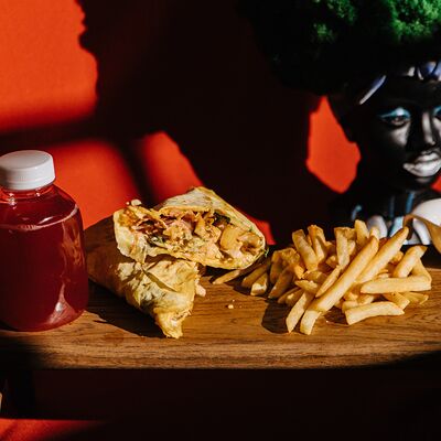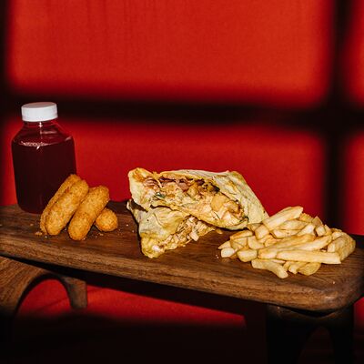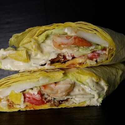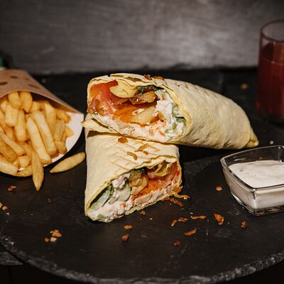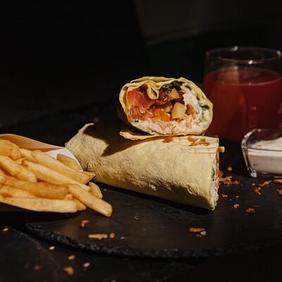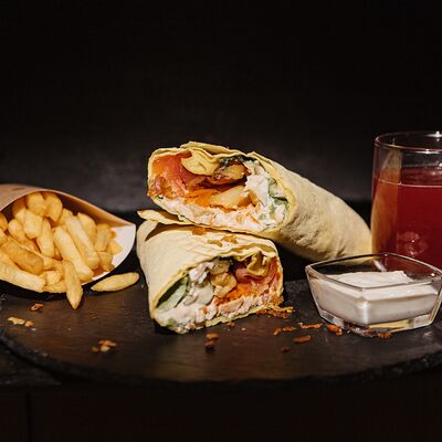 Шаурма с креветкой М, картофель фри (130 г), соус на выбор, напиток Добрый (лимон-лайм) 0,33