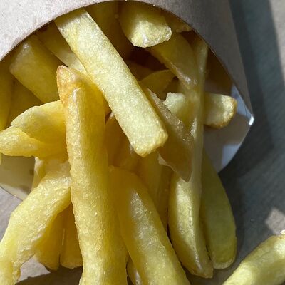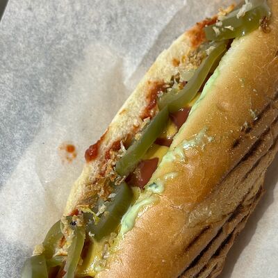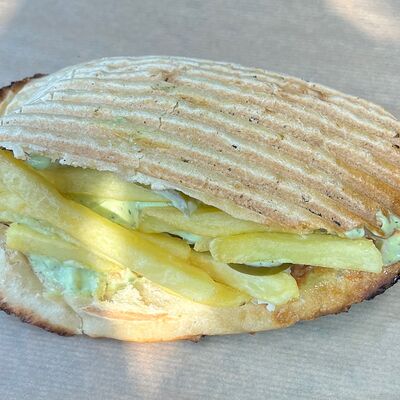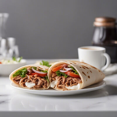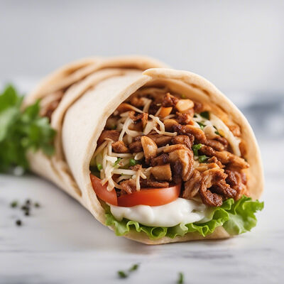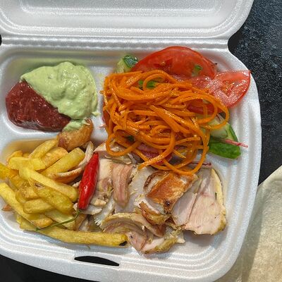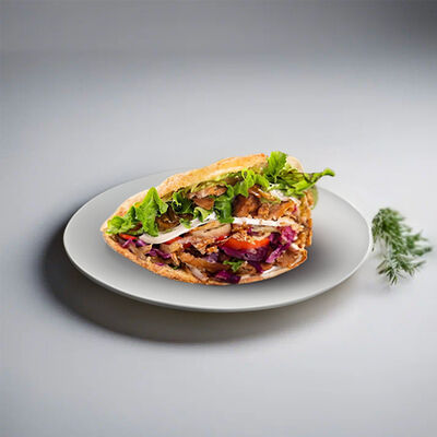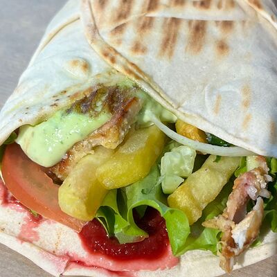 Греческая пита, сочная курочка, лист салата, помидор, огурцы, картошка фри, лук маринованный, два вида фирменного соуса