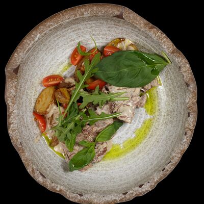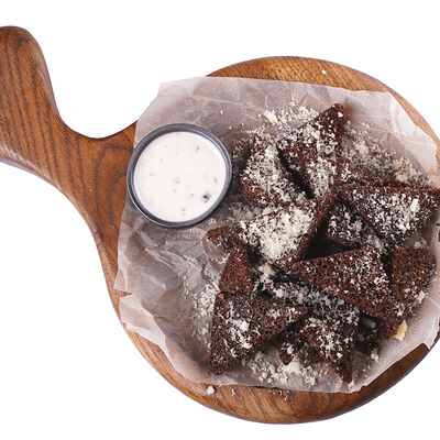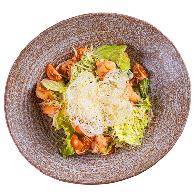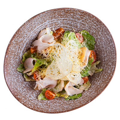 Куриная грудка, салат ромен, пармезан, помидоры черри, соус цезарь, гренки