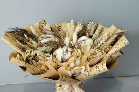 Состав: Пампасная трава - 20; Пшеница - 10; Лагурус - 10; Овес - 7; Хлопок - 3; Эрингиум - 2; Лимониум - 1; Дизайнерская упаковка - 5; Оазис - 1; Тишью - 1; Лента - 1. Ширина: 50см. Высота: 35см.
