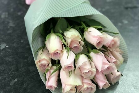 Состав: Роза Кения - 15; Корейская бумага - 1; Лента атласная - 1. Ширина: 19см. Высота: 40см.
