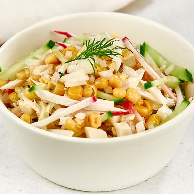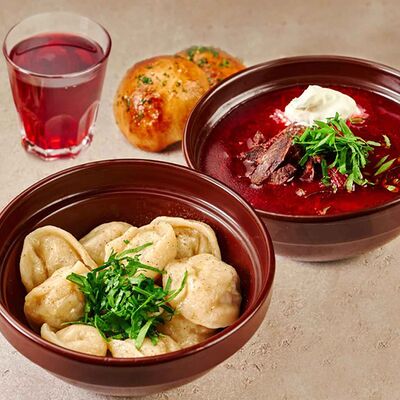 Суп на курином бульоне, салат дня, хлеб, пельмени или вареники, пакетик чая (1 шт.)