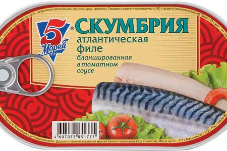 Скумбрия атлантическая 5 Морей бланшированная филе в томатном соусе доставка