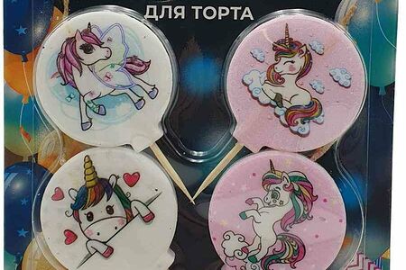 Свечи для торта на пиках Круг с принтом Единороги, 4 см × 4 шт. доставка