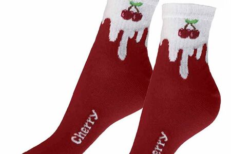 Носки средней высоты с резинкой лапшой – модной в этом сезоне. Принт "вишни" на паголенке. Такие носки станут "вкусным" украшением вашего летнего гардероба!