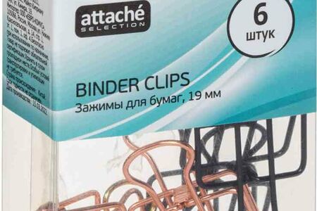 Металлические зажимы для бумаг attache selection используются для скрепления документов без использования степлеров. Зажимы из металла с цветным металлизированным покрытием. Цвета зажимов в упаковке: золотистый, бронзовый, черный. Размер зажима: ширина 19 мм, высота 58 мм, глубина закладки 18 мм. Позволяет скреплять до 65 листов плотностью 80 г/кв. м, не деформируя при этом бумагу. Зажимы для бумаг поставляются по 6 штук в пластиковой упаковке с европодвесом.
