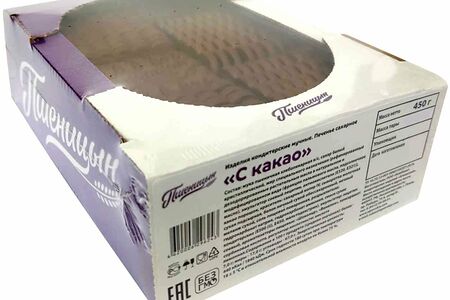 Сведения о составе: Мука пшеничная хлебопекарная высший сорт, сахар белый кристаллический, жир специального назначения (рафинированные дезодорированные растительные масла в натуральном и модифицированном виде (фракции пальмового масла, подсолнечное масло), эмульгатор соевый лецитин, антиокислители (е320, е321)), какао порошок, краситель: сахарный колер iv, сыворотка молочная сухая подсырная, белок яичный сухой обессахаренный, яичный меланж сухой, соль пищевая поваренная, разрыхлители: гидрокарбонат натрия, гидрокарбонат аммония, смеси сухие кондитерские (е500 (ii), е450, мальтодекстрин), эмульгатор: лецитин соевый, ароматизаторы пищевые: "шоколад", "ванилин", консервант: сорбиновая кислота, регулятор кислотности: кислота лимонная.Пищевая ценность: 440 ккалПроизводитель: Ооо "Комбинат Кондитерских Изделий "Агеевский", Россия