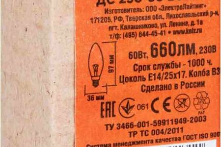 Лампа накаливания E14 прозрачная свеча 60 Вт ТМ Калашниково доставка