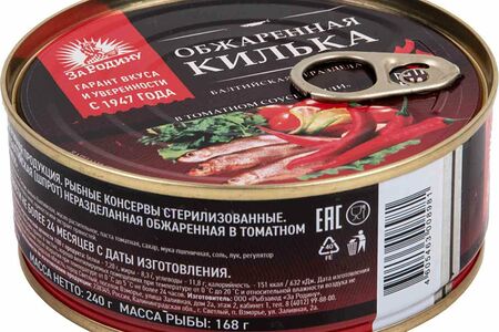 Сведения о составе: Килька балтийская, масло растительное, паста томатная, сахар, мука пшеничная, соль, лук, регулятор кислотности - кислота уксусная, перец чили, пряности или экстракт пряностей.Пищевая ценность: 151 ккалПроизводитель: Ооо "Рыбзавод "За Родину", Россия