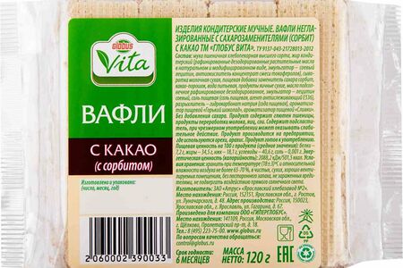 Вафли Globus Vita без сахара с какао, 120 г доставка