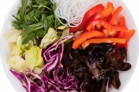Сведения о составе: Капуста краснокочанная, фунчоза, перец болгарский, грибы муэр, салатный микс: романо, фризе, радиччио; руккола, кунжут, масло подсолнечное, уксус винный, сахар, перец черный молотый, соль, заправка корейская для капусты.Производитель: ООО "Гиперглобус", Россия