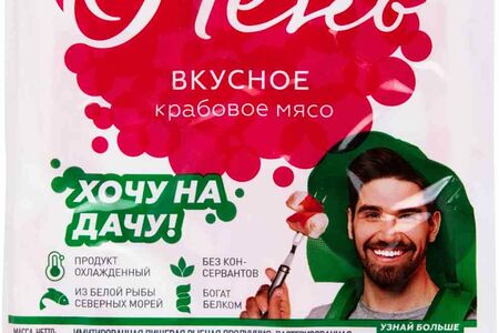 Имитированная пищевая рыбная продукция, пастеризованная. Крабовое мясо очень (имитация), охлажденный продукт. Произведено из мороженого сырья.